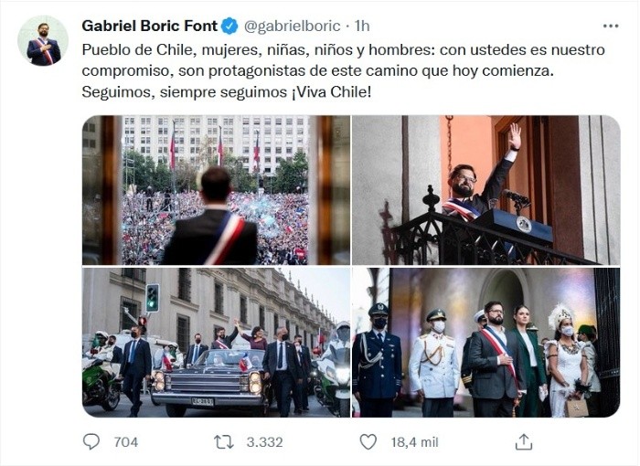 El nuevo presidente de Chile, el progresista Gabriel Boric, pidió a los chilenos trabajar juntos por "un nuevo Chile" en un histórico discurso con numerosos guiños al derrocado Salvador Allende (1970-1973) y recibido con "esperanza" entre sus partidarios y con escepticismo entre quienes no votaron por él."Quiero que sepan que no llegamos aquí sólo para llenar cargos, para generar distancias inalcanzables, sino para entregarnos en cuerpo y alma al compromiso de hacer mejor nuestra patria", proclamó desde un balcón del capitalino Palacio de La Moneda, sede de Gobierno.Entre ovaciones y al son de "El pueblo unido jamás será vencido" y "Chile despertó", miles de personas escucharon la intervención, un evento mucho más informal y cercano que la tradicional ceremonia de la mañana, en la que prestó juramento y recibió la banda presidencial de la mano de su antecesor, Sebastián Piñera.Junto a las banderas afines a Boric, el público también ondeaba telas de otros colectivos minoritarios: de los indígenas mapuches -que representan el 7 % de la población-, el movimiento feminista o la comunidad de la diversidad sexual."El pueblo de Chile es protagónico en este proceso. No estaríamos aquí sin sus movilizaciones", señaló Boric durante su intervención, cargada de gestos hacia el feminismo, el ecologismo, economía social o diversidad.El mandatario, que a sus 36 años es el presidente más joven y votado de la historia de Chile, arribó a la sede de Gobierno junto a la primera dama, Irina Karamanos, y tras saludar al público y desfilar delante de la guardia de honor, ingresó al Palacio para ofrecer sus primeras palabras.Para la politóloga de la Universidad de Chile, Daniela Campos, este primer discurso ha sido "muy emotivo y cargado de simbolismo"."Habló de las mujeres, de las disidencias, de los pueblos imaginarios. Le dio mucho protagonismo al pueblo, pero también les advirtió de alguna manera que no podrá hacer todo en su mandato", declaró."Hemos visto una toma de mando nueva, con mucha participación, menos acartonada, sin corbatas. Me parece interesante esta mezcla y cómo Boric va a modernizar las instituciones con componente popular", puntualizó Julieta Suárez-Cao, de la Universidad Católica y Red de Politólogas.Una vez más, el presidente citó al socialista Salvador Allende, que en 1973 y en el mismo Palacio desde donde Boric ofrecía su discurso, fue derrocado durante un bombardeo que marcó el inicio de la dictadura de Augusto Pinochet (1973-1990)."Adelante siempre, sabiendo que pronto se abrirán las grandes alamedas por donde pasará el hombre libre, para construir una sociedad mejor", señaló más de medio siglo después de que Allende pronunciara las mismas palabras.Este no fue el único gesto al expresidente socialista: antes de ingresar a La Moneda, Boric visitó y saludó la estatua que hay a las puertas del Palacio, levantada en su honor, en un gesto de homenaje.El exdiputado y antiguo líder estudiantil recalcó que el cumplimiento de sus metas "no será fácil", y aclaró que será necesario e invitó a todos a apoyar su proyecto, sus defensores y detractores, "porque los ojos del mundo están mirando".Entre los principales retos que citó figuran el cambio climático, la crisis energética, la situación migratoria en la frontera norte o la violencia contra las mujeres y disidencias."Cometeremos errores y lo deberemos enmendar con humildad escuchando siempre a los que piensan distinto, apoyándonos en el pueblo de Chile", manifestó.Para los expertos, su gobierno supone el inicio de una nueva era política, puesto que es el primer presidente ajeno a los dos grandes bloques de centro que gobernaron desde el retorno a la democracia en 1990 y trae bajo el brazo una agenda de cambios profundos y la idea de instalar en Chile un estado de bienestar.Para lograrlo, dijo rotundamente, "se necesita redistribuir la riqueza que producen quienes habitan nuestra patria"."Mi sueño es que, cuando terminemos, podamos mirar a nuestros hijos, a nuestras hermanas, a nuestras vecinas, y sintamos que hay un país que nos protege y acoge, que nos cuida, que nos garantiza derechos", concluyó.JM