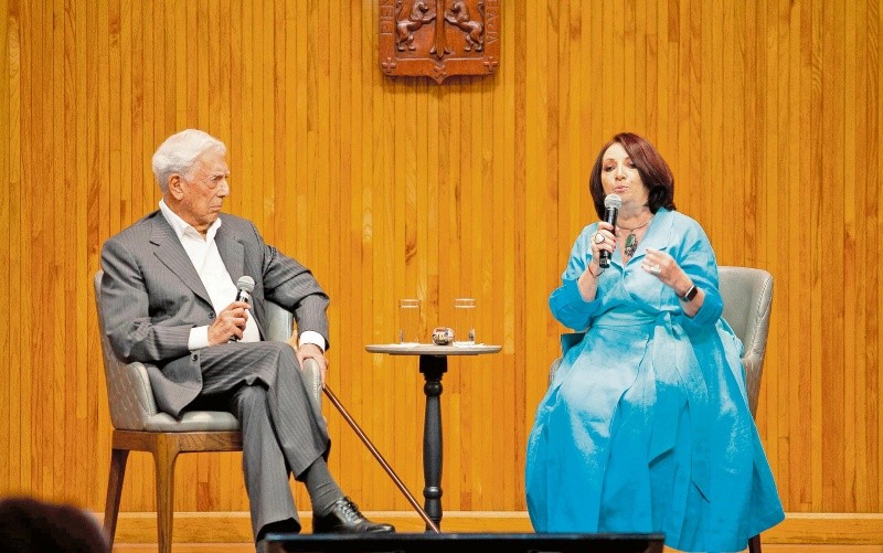 El escritor Mario Vargas Llosa y la directora de la FIL, Marisol Schulz, en una charla en el Paraninfo Enrique Díaz de León. CORTESÍA