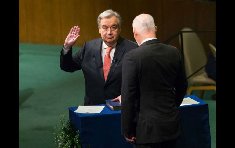 NUEVA YORK, ESTADOS UNIDOS (12/DIC/2016).- El ex primer ministro portugués António Guterres prestó juramento el lunes como secretario general de las Naciones Unidas, para suceder a Ban Ki-moon.El ex alto comisionado de la ONU para refugiados fue elegido por la Asamblea General por aclamación y asumirá el 1 de enero.Guterres, de 67 años, es el noveno secretario general en los 71 años de historia de la ONU.Su experiencia ejecutiva como jefe de gobierno de un país y luego como jefe de la comisión para refugiados de 2005 a 2015 lo proyectaron al primer plano entre los 13 candidatos al puesto en encuestas informales en el Consejo de Seguridad.Antes de la juramentación, los 193 miembros de la Asamblea General rindieron homenaje a Ban.