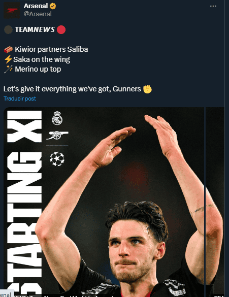 Deportes | Real Madrid vs Arsenal EN VIVO: sigue online las jugadas destacadas de la Champions League Entérate de los goles del partido de este miércoles en Madrid Oralia López 16 de abril de 2025 - 15:02 hs 1 ‒ 2 ¡Eliminado! Real Madrid pierde con global de 5-1 y queda fuera de la Champions League. ¡Gooool! Martinelli le regresa la ventaja al Arsenal en el añadido, al 90+3. ¡Gooool! Vinicius anota al 67; se empata el partido. ¡Goooool! Bukayo Saka anota al 65' y abre el marcador en favor del Arsenal. ¡Arranca el segundo tiempo! Comienza el complemento en el Santiago Bernabéu. Medio tiempo en Madrid Terminan los primeros 45 minutos. Los merengues buscarán el milagro en la segunda parte. Penal anulado El VAR revisa la decisión del árbitro y echa atrás un penalti a favor del Real Madrid. ¡Penal para Arsenal! Saka cobra al minuto 13, pero Thibaut Courtois lo detiene. El marcador sigue sin moverse. ¡Arranca el partido! Rueda el balón en el Estadio Santiago Bernabéu, el equipo local saldrá con todo para remontar el marcador. Listas, las alineaciones para el partido Temas Real Madrid Arsenal Futbol Internacional Champions League UEFA Lee También ¿Qué marcador necesita Real Madrid para avanzar a semifinales de la Champions League? México califica de "dudoso" el triunfo de Daniel Noboa en Ecuador Real Madrid vs. Arsenal: Dónde ver EN VIVO los cuartos de final de la Champions League Inter de Milán vs. Bayern Múnich: Dónde ver EN VIVO los cuartos de final de la Champions League