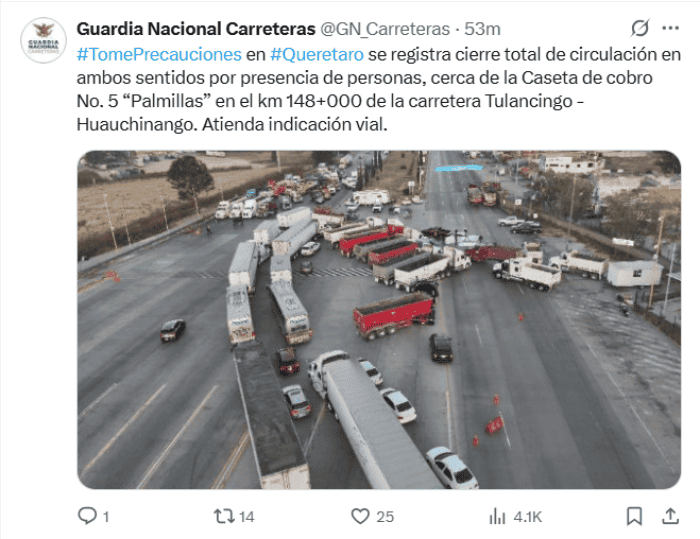 Este lunes 24 de noviembre, transportistas y campesinos de México mantendrán bloqueos y cierres carreteros en distintos puntos del país. Te mantendremos al tanto de las movilizaciones. Los integrantes del Frente Nacional para el Rescate del Campo Mexicano (FNRCM) y de la Asociación Nacional Transportista (ANT) iniciaron protestas desde principios del mes frente al Palacio Nacional. Exigían mayor seguridad en carreteras, acciones contra la corrupción que afecta al sector y apoyos directos para productores de maíz. Sin embargo, al no obtener una respuesta favorable, decidieron llevar su inconformidad a las carreteras hoy. La Confederación de Cámaras Industriales (Concamin) alertó a sus agremiados sobre la magnitud de los bloqueos previstos. En una circular interna, advirtió que los cierres están siendo organizados por el Frente, el Movimiento Agrícola Campesino y la Asociación Nacional de Transportistas, por lo que recomendó a las empresas activar protocolos de prevención ante un posible cierre total de varias zonas del país. Además, informó que podrían registrarse afectaciones adicionales debido a la toma de aduanas en la Frontera Norte, lo que impactaría el flujo de mercancías. El Informador continuará atendiendo estos datos en las carreteras y caminos de México. Te invitamos a seguir estas actualizaciones al momento.