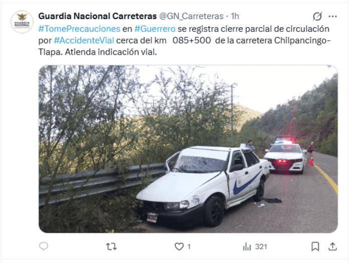 • En Guerrero, se registra cierre parcial de circulación por accidente vial, cerca del km 367+500 de la carretera Chilpancingo-Acapulco