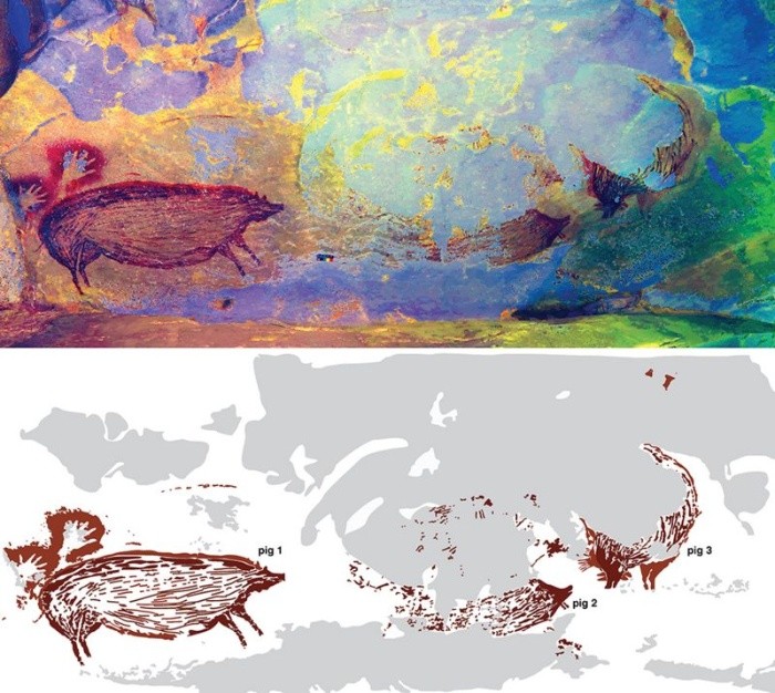 Un equipo de arqueólogos ha descubierto la pintura rupestre de animales más antigua del mundo de la que se tiene conocimiento.Fue encontrada en la cueva Leang Tedongnge, en un valle remoto en la isla de Sulawesi, en Indonesia.La imagen representa un cerdo salvaje que se cree que fue dibujado hace 45.500 años.Está pintada con pigmento ocre rojo oscuro a tamaño natural y parece ser parte de una escena narrativa mucho mayor.Su descubrimiento proporciona la evidencia más antigua de que hubo asentamientos humanos en la región."Las personas que la hicieron eran completamente modernas, eran como nosotros, tenían la capacidad y las herramientas para pintar cualquier pintura que quisieran", explicó Maxime Aubert, coautor del informe publicado en la revista Science Advances.Como especialista en datación, Aubert identificó un depósito de calcita formado en la parte superior de la pintura y usó el sistema de datación de isótopos con uranio para determinar que el depósito tenía 45.500 años.Esto hace que la pintura sea como mínimo así de antigua."Pero podría ser mucho más antigua porque la datación que estamos usando solo fecha la calcita de encima", agregó.El informe dice que la pintura, que mide 136 cm por 54 cm, representa un cerdo verrugoso, un tipo de cerdo salvaje, que parece tener cuernos, dos características de los machos adultos de la especie.Hay dos huellas de manos sobre el lomo del cerdo que parece estar frente a otros dos ejemplares de esta especie, aunque de ellos solo se conserva una parte."El cerdo parece estar observando una pelea o interacción social entre otros dos cerdos verrugosos", agregó Adam Brumm, coautor de la publicación.Para hacer las huellas de las manos, los artistas habrían tenido que colocar sus manos sobre una superficie antes de escupir pigmento sobre ella, dijeron los investigadores.El equipo espera poder extraer también muestras de ADN.La pintura es la representación artística de una figura más antigua del mundo, pero no es el arte más antiguo producido por humanos.En Sudáfrica existe un dibujo similar a un hashtag (#) que se cree que fue hecho hace 73.000 años.Este sería el dibujo más antiguo conocido.Sulawesi se encuentra en una ubicación clave.Es la isla más grande de un grupo al que los científicos a menudo se refieren como Wallacea, en honor al gran naturalista del siglo XIX y XXAlfred Wallace.El grupo se asienta en una línea divisoria, a cada lado de la cual se encuentran animales y plantas muy diferentes.Pero el significado de Wallacea también es que debe haber sido un lugar de asentamiento para los humanos modernos en su viaje hacia Australia."Sabemos que estuvieron en esa masa terrestre hace unos 65.000 años, por lo que es razonable suponer que también estaban en Sulawesi al mismo tiempo o incluso antes", explica el corresponsal de Ciencia de la BBC Jonathan Amos."Esto plantea la tentadora teoría de que existe arte figurativo, ya sea en Sulawesi o en las islas cercanas, que supera los 45.500 años de antigüedad", añade."Las colinas de piedra caliza, situadas a una hora en coche de Makassar, tienen innumerables recovecos, como los de la cueva de Leang Tedongnge", dice.Por eso, Amos cree que es probable que haya más descubrimientos en el futuro.***Ahora puedes recibir notificaciones de BBC Mundo. Descarga la nueva versión de nuestra app y actívalas para no perderte nuestro mejor contenido.