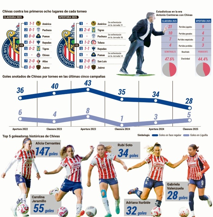 Chivas Femenil está atravesando por uno de sus peores momentos en la historia de la Liga MX Femenil. Como sucede en muy pocas ocasiones, las Rojiblancas están situadas en el décimo lugar de la clasificación del Apertura 2025 con 14 puntos y registran sólo una victoria en sus últimos seis partidos disputados, datos que reflejan el desempeño que han tenido las dirigidas por Antonio Contreras en el actual torneo. Además, parece que al Rebaño se le ha olvidado cómo ganar ante los equipos que se encuentran entre los primeros ocho lugares. Desde que el estratega español tomó las riendas, el cuadro tapatío ha conseguido 12 victorias en fase regular entre el Clausura 2025 y la presente campaña, de las cuales solo tres se obtuvieron frente a escuadras que ocupaban un lugar en puestos de liguilla.En el pasado torneo, las Chivas lograron sacar un triunfo contra Atlas, equipo que terminó en la séptima posición. Sin embargo, cuando se enfrentaron en el Clásico Tapatío, las Rojinegras aún estaban peleando por meterse entre los primeros ocho. Fuera de ahí, el Guadalajara no pudo vencer a América, Pachuca, Pumas, Rayadas, Tigres y Juárez, escuadras que se metieron a la fiesta grande del Clausura 2025.En lo que va del Apertura 2025, las Rojiblancas han enfrentado a cinco de los equipos que están en sitios privilegiados y solo han podido ganarle al Atlético de San Luis (2-0), mismo que se ubica en el séptimo peldaño, y a Juárez (1-0), que está en el octavo sitio. Destacando que, jugó contra estas dos escuadras en las jornadas 1 y 3 del torneo, respectivamente.En la otra cara de la moneda, Chivas continúa sin saber lo que es vencer a escuadras como Tigres y Rayadas. Antonio Contreras no ha encontrado la fórmula de imponerse a conjuntos de mayor jerarquía o que cuentan con un proyecto más ambicioso, como es el caso de Toluca, al que tampoco pudo derrotar en la fecha 6.Por si fuera poco, al Guadalajara Femenil también le ha costado tener más contundencia frente al arco desde que el director técnico español se encargó del equipo. El Clausura 2025 fue el torneo con menos goles en las últimas cinco campañas para el Rebaño con 28 dianas en la fase regular.Desde su llegada, Contreras apostó por priorizar el orden defensivo para tener mayor certeza a la hora de atacar. En el pasado certamen, Chivas logró destacarse sobre el resto de los equipos al ser la mejor defensiva con solo 14 goles en contra.Sin embargo, en el Apertura 2025, las rojiblancas han perdido esa característica. En solo nueve jornadas, han tolerado 10 anotaciones, mismas que permitieron en las 17 jornadas del Clausura 2025.Y en cuanto a los tantos a favor, Chivas acumula 12, seis menos que el torneo anterior después de nueve fechas jugadas.LA VOZ DEL EXPERTONatalia León, analista y periodistaEl Guadalajara ha tenido que lidiar con el rezago en la formación de futbolistas mexicanas. Porque, mientras figuras internacionales siguen llegando a México con un recorrido importante y después de haber jugado en las mejores ligas del mundo, el Rebaño ni siquiera cuenta con las nacionales que son base de Selección.“Estamos en un punto en donde a Chivas le está afectando que haya siete extranjeras en la liga, y honestamente, Chivas al no tener a las mejores mexicanas —¿qué es tener a las mejores mexicanas?, pues básicamente a la base de la selección mexicana—, no le alcanza contra extranjeras. Y no es nada más decir, las mexicanas no podemos, no es eso, y ahí hay un trasfondo importante, ya que en México estamos rezagados con el futbol de mujeres. Antes del inicio de la Liga MX femenil, no había estructuras tan sólidas dentro del futbol mexicano femenil, era muy difícil para una mujer profesionalizarse en este deporte”, mencionó León.“Mientras que, en países como España, Inglaterra, Alemania y Estados Unidos ya había ligas, tenían un avance en ese rubro y sí se le toma muy en cuenta a la mujer para jugar futbol con fuerzas básicas. En México, la mujer futbolista tiene un rezago técnico, táctico y físico, entonces llegan extranjeras de altísimo nivel como las que estamos viendo en Toluca, Tigres, América, etc., y Chivas, que no tiene, por lo menos, a la base de la selección mexicana, la están superando”, finalizó.
