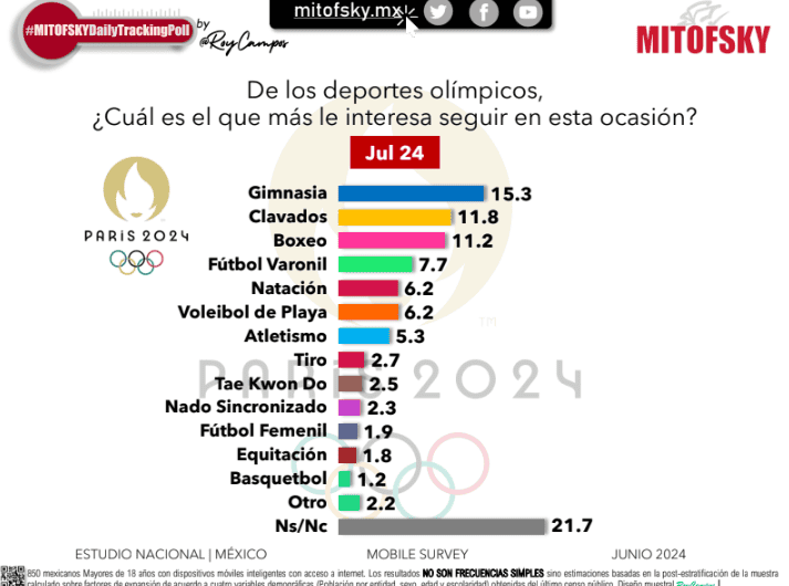 Consulta Mitofsky publicó recientemente cuáles son las disciplinas que más siguen los mexicanos, entre las que destacan estas opciones. Según la encuesta realizada a personas mayores de 18 años, las competencias favoritas son gimnasia con 15.3% de las preferencias, seguida de clavados (11.8%); boxeo (11.2); futbol varonil (7.7); natación (6.2); voleibol de playa (6.2); atletismo (5.3); tiro (2.7); taekwondo (2.5); nado sincronizado (2.3); futbol femenil (1.9); equitación (1.8); y basquetbol (1.2). También 2.2% opinaron que no saben, y 21.7% no contestaron algo en específico.