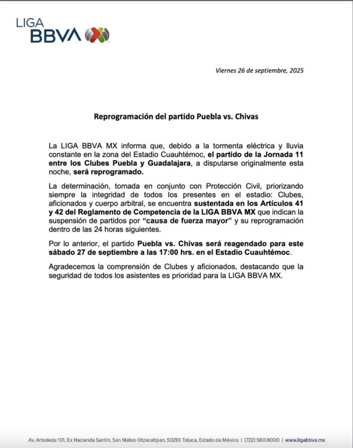 La Liga BBVA MX informó la reprogramación del encuentro entre Puebla y Chivas correspondiente a la Jornada 11 del torneo Apertura 2025, debido a las condiciones climáticas adversas registradas la noche de este viernes 26 de septiembre en la capital poblana.