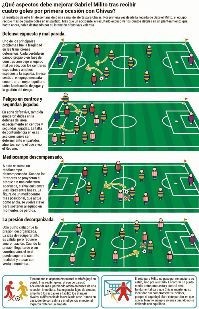 Chivas tomó el liderato de la Liga MX desde la jornada 12 del Clausura 2026 y, en todo el torneo, no ha estado nunca por debajo del tercer lugar. Sin embargo, la goleada recibida el sábado (4-1) frente a Tigres ha encendido las alarmas, de cara a la liguilla.La falta de concentración en la defensa fue evidente en ese partido, con pérdidas de balón que desembocaron en goles en contra. Sin embargo, los errores ya estaban presentes desde jornadas anteriores. En los últimos tres juegos, las Chivas han recibido 8 anotaciones, lo que empieza a generar preocupación.El modelo de juego de Gabriel Milito implica salir desde la propia cancha y ejercer presión constante en la zona rival, pero esas mismas características crean situaciones de riesgo.Al respecto, el periodista David Medrano Félix señaló una arista que, en teoría, no debería ser problema, sino todo lo contrario: equilibrar la presencia de Luis Romo, Diego Campillo y Daniel Aguirre en la plantilla.En el programa "La de 8", Medrano Félix expresó su punto de vista:"Le debe quedar claro a Gabriel Milito que, hoy en día, no le caben juntos Romo y Diego Campillo. ¿Qué hace? Quita a Aguirre. El técnico entiende que es una terrible injusticia mandarlo a la banca, así que lo mete de volante. Y de volante, con Aguirre, el equipo pierde ese puesto y la salida que te da Aguirre como central por derecha."Según el periodista, el once titular de Chivas debería ser el siguiente:Raúl Rangel. Richard Ledezma, Daniel Aguirre, Luis Romo, José Castillo, Bryan González, Omar Govea, Fernando González, Roberto Alvarado, Efraín Álvarez, Armando González.Diego Campillo y Brian Gutiérrez deberían ser reservados como refuerzos según la dinámica del juego.Los próximos juegos de Guadalajara, contra Puebla, Necaxa y Tijuana, parecen ideales para terminar como primer lugar, pero ofrecen pocas oportunidades para corregir los errores que podrían costar caro frente a rivales más fuertes en la liguilla.Sin lugar a dudas, uno de los clubes más perjudicados por la lista de convocados de Javier Aguirre para la próxima Copa del Mundo 2026 será Chivas. Se espera que al menos tres jugadores rojiblancos formen parte de la convocatoria del "Vasco".Además, en los últimos días surgió la preocupación sobre si Guadalajara podría perder a algunos de sus futbolistas durante la liguilla del Clausura 2026. Sin embargo, Duilio Davino, director deportivo de Selecciones Nacionales, brindó tranquilidad al club con su declaración.Davino aseguró que "no habrá manera de que puedan estar [jugadores] en la lista, se pierdan la liguilla y no vayan a estar en el Mundial".El dirigente también dejó claro que los futbolistas convocados de la Liga MX para iniciar la concentración el 6 de mayo estarán asegurados para participar en la Copa del Mundo.Por último, Davino explicó que primero se anunciará una convocatoria con jugadores de la liga local y, semanas después, se dará a conocer otra lista con los convocados que juegan en Europa. La primera convocatoria será publicada antes de la última jornada del Clausura 2026.