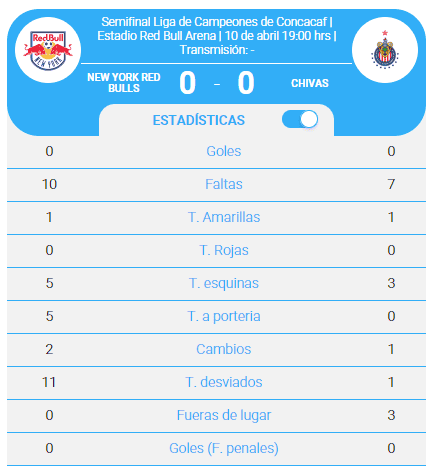 Chivas obtuvo un sufrido empate 0-0 en casa de los Red Bulls de Nueva York y avanzó a la Final de Concachampions gracias al global 1-0.Tanto Chivas como Red Bulls usaron los mismos cuadros iniciales de la ida, con excepciones obligadas por acumulación de tarjetas o expulsiones.Chivas no pudo contar con Jair Pereira y los Red Bulls no pudieron alinear a Collin y Muyl.Durante los 90 minutos, los neoyorquinos impusieron un juego físico y velocidad que Chivas nunca pudo superar.Los Red Bulls ganaron cada pelota dividida, y presionaron en todas las zonas del campo, creando constantemente situaciones de superioridad numérica.El Rebaño no logró hilvanar más de cuatro pases en toda la primera parte y no generó ocasiones de gol.Los locales se dieron un festín ante un Rebaño impotente y dispararon a puerta diez veces en el primer tiempo. Sólo los errores en la definición y los aciertos del portero Cota salvaron a los rojiblancos.En la segunda parte, Chivas mejoró ligeramente, generando sus primeras jugadas de gol y obteniendo sus primeros tiros de esquina, aunque los Red Bulls no cesaron en su asedio al área rojiblanca. Sufriendo hasta el último segundo, esta versión inédita del Rebaño, defensivo y temeroso al ataque, obtuvo el 0-0 y el pase a la Final, en la que se enfrentará al ganador de la serie entre América y Toronto FC.NEW YORK RED BULLS: Robles, Parker, Long, Murillo, Etienne Jr. (Rivas, 75'), Lawrence, Adams, Valot, Davis, Royer (Gamarra, 57'), Wright-Phillips.CHIVAS: Cota, Alanís, Salcido, Hernández, Pineda, Pérez, Brizuela, Pizarro, C. Cisneros, Pulido, Godínez (Zaldívar, 90+1').