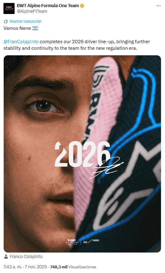 Buenas noticias para los aficionados sudamericanos de la Fórmula 1.Este viernes 7 de noviembre se anunció que el argentino Franco Colapinto fue ratificado como piloto del equipo Alpine para la temporada 2026 de la F1.Franco Colapinto, de 22 años, volverá a formar dupla con el francés Pierre Gasly."Vamos Nene", publicó Alpine en redes sociales, con un emoticón de la bandera de Argentina, antes del inicio del fin de semana de competencia en el Gran Premio de Brasil 2025.Colapinto "completa nuestro line-up de pilotos para 2026, dándole estabilidad y continuidad a nuestro equipo para la era de nuevas reglas", agregó Alpine.Las nuevas reglas de la próxima temporada de la F1 traen cambios, con monoplazas "más ligeros, más potentes y con mayor énfasis en la habilidad del piloto", según espera la FIA (Federación Internacional de Automovilismo)."Tengo buenas sensaciones para 2026", celebró Colapinto en declaraciones divulgadas por Alpine."Para mí representar a mi país en este deporte (…) es algo que soñé toda mi vida. Estoy realmente emocionado de haber vuelto este año a la Fórmula 1, pero estoy aún más emocionado de regresar en 2026 con el mismo equipo, con la misma gente", continuó.Franco Colapinto revolucionó a Argentina en 2024, en su primer año en la máxima categoría de los motores, pero ha tenido un 2025 complicado, sin haber inaugurado su casilla de puntos hasta el momento."Cuando tienes resultados difíciles es cuando realmente aprendes más", expresó el piloto, que agradeció el apoyo de la afición argentina, que suele movilizarse en masa para seguirlo en los grandes premios, un respaldo que considera "de otro planeta".Su coequipero Pierre Gasly, de 29 años, acumula 20 puntos esta campaña. Ha sumado en cinco carreras, con el sexto puesto en el Gran Premio de Gran Bretaña, en julio pasado, como mejor aparición en esta temporada.*Mantente al día con las noticias, únete a nuestro canal de WhatsAppOF