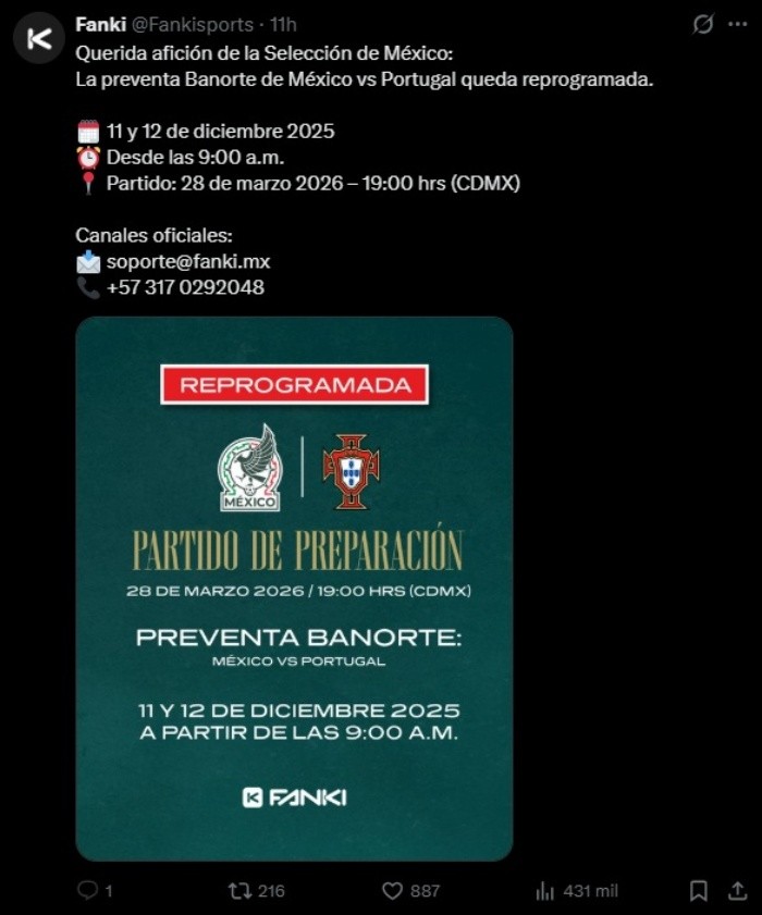 La preventa exclusiva para clientes Banorte de entradas para el partido de reinauguración del estadio Azteca, a celebrarse entre las selecciones de México y Portugal el 28 de marzo de 2026, debía iniciar ayer, sin embargo, fue suspendida por fallas en la plataforma Fanki, encargada de la expedición de los boletos. No obstante, el problema ha sido superado y ya hay una nueva fecha.El banco, que adquirió los derechos de nombre del mítico estadio y es uno de los patrocinadores principales de la Selección Mexicana, informó en sus redes sociales que la preventa para sus tarjetahabientes tendrá lugar el jueves 11 y el viernes 12 de diciembre.La empresa Fanki confirmó esta información y puso a disposición de los aficionados sus canales de contacto para resolver dudas: soporte@fanki.mx y +573170292048. También precisó que su sitio oficial es fanki.com.mx.Preventa Banorte – México vs PortugalEs importante tener en cuenta que hay un límite de cuatro boleto por cliente y que la venta de entradas al público general iniciará el sábado 13.La reinauguración del estadio Azteca es un grado más en la fiebre mundialista, que parece haber tomado fuerza tras el sorteo de grupos, realizado el pasado 5 de diciembre. El entusiasmo de los aficionados generó un tráfico muy elevado en la página de Fanki. No obstante, este mismo interés fue aprovechado por ciberdelincuentes que intentaron afectar la plataforma. Así lo indicó la boletera en un comunicado:“Queremos informar a toda la comunidad que, durante el proceso de apertura de la preventa para el partido México vs Portugal, detectamos un volumen de tráfico malicioso que comprometía la estabilidad y seguridad de nuestra plataforma. Minutos antes de habilitar la venta, nuestro equipo identificó esta actividad anómala y, por protocolos de protección y seguridad, tomamos la decisión de detener la operación y deshabilitar temporalmente la página”.El partido contra Portugal será el último de la Selección Mexicana en el país previo a la Copa del Mundo. En él se podrá ver el grado de preparación y quizá una versión definitiva del cuadro titular. La preparación del Tri cerrará en Chicago el 31 de marzo frente a Bélgica.Además, se prevé la participación de Cristiano Ronaldo, una leyenda viva del futbol que podría dejar su huella en el mismo recinto donde brillaron Pelé y Maradona.