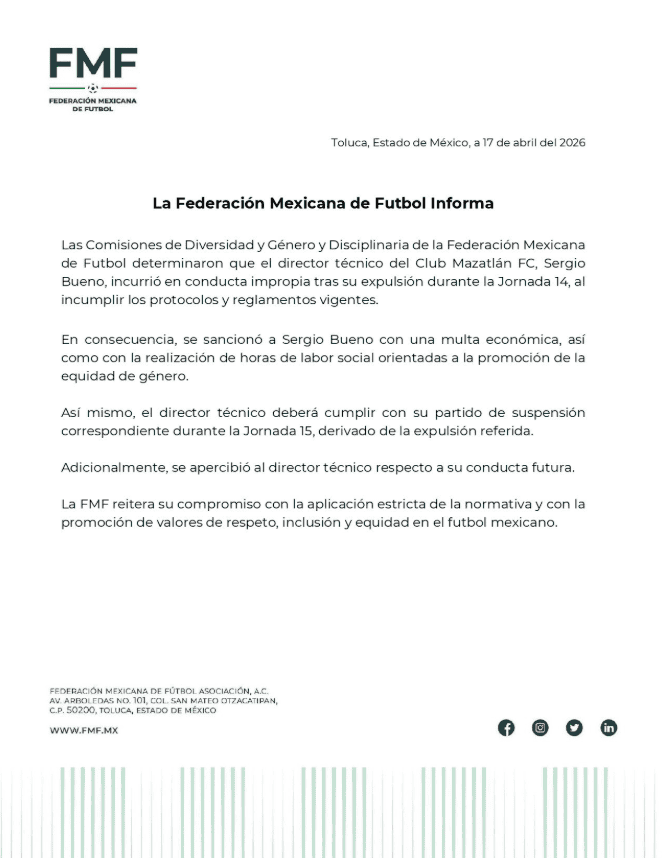 "Las Comisiones de Diversidad y Género y Disciplinaria de la Federación Mexicana de Futbol determinaron que el director técnico del Club Mazatlán FC, Sergio Bueno, incurrió en conducta impropia tras su expulsión durante la Jornada 14, al incumplir los protocolos y reglamentos vigentes", reveló la FMF mediante un comunicado.
