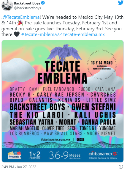 A pesar que el mundo sigue en la pandemia por COVID-19, los espectáculos continúan o incluso se crean algunos nuevos, este es el caso del Festival Emblema, el cual traerá artistas como los Backstreet Boys, Gwen Stefani y Kali Uchis, además de algunas otras propuestas nacionales y latinoamericanas.Este jueves se dio a conocer el cartel de la edición 2022 de este festival que se llevará a cabo el 13 y 14 de mayo en el Autódromo Hermanos Rodríguez y en el que participarán alrededor de 28 artistas musicales.Tecate Emblema tuvo que cancelar su edición 2021 por el aumento de contagios de coronavirus.Según el cartel dado a conocer, serán los Backstreet Boys, Gwen Stefani, Kali Uchis y Chvrches los headliners.El festival anunció que los boletos que fueron adquiridos para la edición 2020 serán válidos para este año, por los que no será necesario cambiarlos por unos nuevos.En las propuestas latinas que se presentarán en el encuentro musical están Danna Paola, Becky G, Kenia Os y Mariah Angeliq.AF