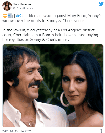 La cantante Cher demandó a Mary Bono, viuda de su exmarido Sonny Bono, porque supuestamente está quedándose con los ingresos derivados de los derechos de autor del dúo Sonny & Cher.Cher y Sonny contrajeron matrimonio en 1964 e iniciaron un dúo artístico que alcanzó gran éxito comercial durante esa década, con canciones como "The Beat Goes On" y "I Got You Babe", hasta que su divorcio en 1975 dinamitó la pareja musical y decidieron repartirse a la mitad todas las regalías de sus canciones.Más adelante, Cher continuó su carrera como actriz y cantante mientras que Sonny se metió en política como congresista del Partido Republicano por California y se casó con Mary Bono, su cuarta esposa hasta que murió en 1998 por un accidente de esquí.Ahora, Cher ha presentado una denuncia en Los Ángeles porque asegura que la viuda de su expareja está reteniendo desde hace años los ingresos que le corresponden por el uso de las canciones de Sonny & Cher."Cuando se divorciaron, el demandante y Sonny acordaron una división equitativa de su propiedad en común y, con ese fin, en 1978 Sonny asignó irrevocablemente a la demandante, como propietaria única en todo el mundo y a perpetuidad, el cincuenta por ciento de sus derechos", dice la demanda.La cantante argumenta en su demanda que Mary ha roto de manera unilateral el contrato previo y los acuerdos con las compañías discográficas, lo que ha supuesto privar a Cher de sus derechos de propiedad intelectual.La demanda, presentada en la Corte Federal de Los Ángeles el miércoles por la tarde, pide 1 millón de dólares en compensación por los daños.Mary Bono, que heredó el escaño de su marido y fue representante de California en el Congreso de EE.UU. hasta 2013, ha declinado hacer comentarios sobre el conflicto.AF