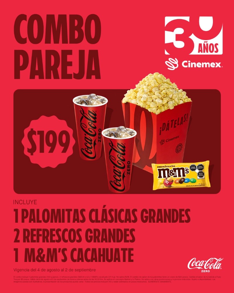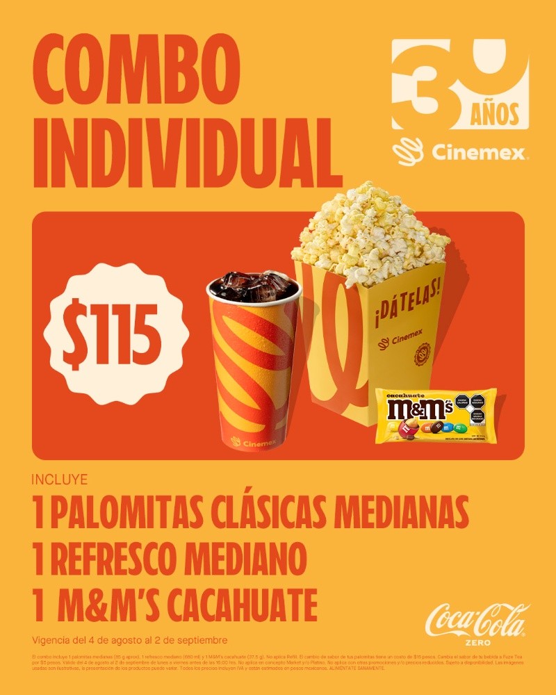 Con motivo de su 30 aniversario, Cinemex tiene sus boletos a tan solo 30 pesos del 4 de agosto al 2 de septiembre de este 2025, una promoción válida en todos sus complejos Cinemex de México, para que veas tus películas favoritas en la pantalla grande a un precio accesible.Los boletos a 30 pesos aplican todos los días antes de las 16:00 horas hasta el 2 de septiembre, aplican únicamente en boletos tradicionales, premium en formatos 2D, 3D y ATMOS.Mientras que para formatos IMAX y 4D el precio es de 70 pesos.Además de los boletos, Cinemex anunció increíbles descuentos en su área de dulcería, donde podrás disfrutar de sus deliciosas palomitas y refrescos, también a un precio increible.Cabe destacar que a diferencia de los boletos a 30 pesos, la oferta en combos está disponible solamente de lunes a viernes, del 4 de agosto al 2 de septiembre, y antes de las 16 horas.Si eres fan del cine y de los buenos descuentos, la tarjeta Círculo INFORMADOR es para ti. Con ella puedes vivir la experiencia Cinemex con hasta 49% de descuento en entradas para salas tradicionales y VIP, ¡en cualquier momento! Además, obtienes promociones especiales en la dulcería para que no falten las palomitas.¿Quieres empezar a disfrutarla? Solo sigue estos pasos:Pero eso no es todo: con tu tarjeta también accedes a beneficios exclusivos en restaurantes, cafeterías, tiendas, hoteles, conciertos, bares, servicios y muchas otras marcas.NA