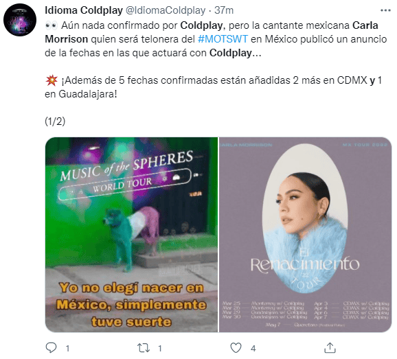 La artista ganadora del Grammy Latino Carla Morrison expande su visita a México de este año, anunciando que será la encargada de abrir los conciertos de Coldplay en Monterrey, Guadalajara y CDMX, se avisó en un comunicado. “Coldplay para mí siempre ha sido una gran, gran inspiración, crecí con ellos, me sanaron el corazón muchas veces y me ayudaron a ver la luz al final del túnel inumerables veces. Compartir el escenario con ellos es un honor inmenso y estoy tan agradecida que me pidieran acampañarles durante toda su gira mexicana, estoy en las nubes con este gran regalo”, comparte Carla.Coldplay está comprometido a reducir el 50% de todas las emisiones de carbono en sus próximos conciertos a través de distintas prácticas sustentables, incluyendo el uso de confeti biodegradable, vasos reciclables, mercancía sostenible, plantar un árbol por cada boleto vendido, entre otros.Tras el aviso de que abrirá los shows de la banda también se reveló en la publicidad la nueva fecha de la alineación en Guadalajara, la cual sería el 30 de marzo además del día 29. También con la información difundida por Carla, se avisa de dos fechas más para la Ciudad de México. De momento ni la banda ni Ocesa han confirmado estos datos.El anuncio llega después de que Carla confirmó su regreso a nuestro país como headliner del Festival Pulso GNP de Querétaro el próximo 7 de mayo. Carla recientemente lanzó cuatro nuevas canciones como parte de su retorno a los reflectores, “Ansiedad”, “No Me Llames”, “Obra de Arte” y “Contigo”. Estas presentaciones de Carla siendo la telonera de Coldplay forman parte de su gira “El Renacimiento”.Tras publicar en sus redes sociales que abriría los conciertos de Coldplay y al darse cuenta que por error avisó de las tres nuevas fechas de la banda. Carla eliminó en Twitter la propia información que había difundido.AF