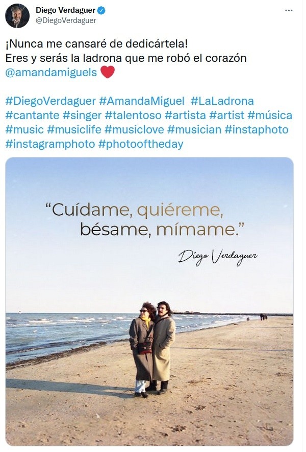 El cantante Diego Verdaguer falleció a los 70 años víctima de COVID-19, pero hasta en sus últimas horas no dejó de recordarle a su esposa Amanda Miguel cuánto la amaba. Ambos intérpretes estuvieron juntos durante 46 años y tuvieron una hija llamada Ana Victoria, hoy de 38 años.En sus redes sociales la última publicación que realizó es una fotografía junto a quien fuera el amor de su vida, acompañada de una frase de la canción "La Ladrona", que grabó en la década de los 80."¡Nunca me cansaré de dedicártela! Eres y serás la ladrona que me robó el corazón", dice la descripción de la publicación donde fue etiquetada la también compositora.A través de Twitter ella le respondió, aunque él ya no pudo ver este mensaje: "Siempre te amaré", escribió Miguel, como despedida hacia su gran amor.Cuando solo tenía 23 años de edad Diego comenzó a cortejar a Amanda, quien para entonces tenía 18. Fue en las calles de su natal Argentina donde surgió el amor, mientras él conducía un coche y la vio a lo lejos, aunque intentó coquetearle ella no le hizo caso, pero él decidió insistir."Después de que la vi alejarse dije: ‘voy a regresar’ y lo que nunca había hecho, fue una circunstancia mágica, porque hizo que yo apretara el acelerador y que nada me detuviese, yo iba hacia la casa de mis padres y di la vuelta a la manzana y empecé a buscar donde se habían ido estas chicas y las encontré", recordó Verdaguer en entrevista.Tomaron un café y cuando él le preguntó a qué se dedicaba ella respondió muy segura: "yo también soy cantante"; al escucharla él quedó cautivado con su voz y después de salir por un mes comenzaron una relación amorosa luego de que se dieron su primer beso frente al río de Buenos Aires."Me acerqué a ella y la besé y le dije: 'me gustaría ser tu novio', ya había pasado un mes y yo no la había tocado más que la mano y darle un beso en la mejilla, pero fui generando esa atracción a propósito, fue una estrategia, digamos que decidí hacer para que fuera algo especial", detalló.En una publicación reciente ella reveló que el secreto de su larga relación se basaba en las ganas que ambos tenían de que todo funcionara. "Hemos crecido juntos", escribió Amanda.Se casaron en 1975 y ocho años después, justo el día de su aniversario de bodas, nació Ana Lucía, su única hija, quien en noviembre pasado los hizo abuelos con la llegada del pequeño Lucca.Juntos sortearon difíciles retos, desde una infidelidad, rumores de divorcio y hasta el distanciamiento de siete meses provocado por la pandemia. Su reencuentro en noviembre del 2020 fue un suceso viral, pues ambos fueron una de las parejas más consolidadas del espectáculo y ya habían manifestado su deseo por volver a estar juntos."Estamos como si hubiéramos pasado una guerra, como si yo hubiera estado en un continente y ella en otro. No es fácil, por un lado, es refrescante, pero ha sido muy largo", dijo él en entrevista.El reencuentro se dio en un estacionamiento de Miami y desde entonces no se separaron más.Justo el pasado 8 de diciembre la pareja celebró su 46 aniversario de bodas. "Que maravilloso ha sido este viaje a tu lado" escribió Verdaguer junto a unas imágenes de la ceremonia que realizaron en la que ella volvió a usar su vestido de novia.Durante su carrera, de 20 discos que hizo el intérprete, 9 fueron junto a su alma gemela. Algunos de los temas más famosos fueron: "Siempre te amaré", "Simplemente amor" y "Hagamos un trato". En una ocasión él aceptó que no podía vivir sin su Amanda, mientras que ella siempre le demostró su amor incondicional."Todo lo que hacemos nos relaciona, nuestras casas son nuestras, hago cosas pensando en ella, ha sido mi inspiración. En la mayoría de la música que he hecho está ella. Amanda es parte de mi universo y lo va a ser hasta que me muera y cuando muera va a seguir siéndolo".OA
