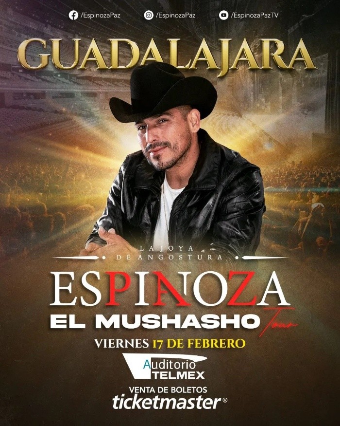El pasado mes de noviembre se dio a conocer que el músico mexicano Isidro Chávez Espinoza, mejor conocido como Espinoza Paz, llegará a la ciudad de Guadalajara para presentar su gira "El Mushasho tour" y deleitar a todos sus fanáticos con sus mejores temas. Espinoza Paz presentará su show el próximo viernes 17 de febrero en el Auditorio Telmex, inmueble en el cual interpretará cerca de dos horas sus mejores éxitos de su carrera musical como "La Mushasha Shula", "El próximo viernes", entre otros.Los boletos ya salieron a la venta a través de la platofamorma de www.ticketmaster.com.mx o bien consegurilos en las taquillas del Auditorio Telmex con los siguientes horarios: El Auditorio Telmex cuenta con diferentes zonas para apreciar el show de Espinoza Paz, a continuación te mencionamos cada una de ellas y los precios. MF