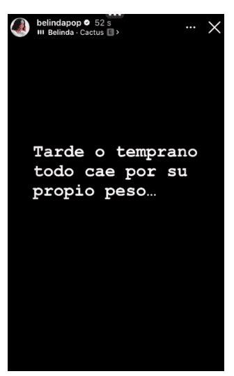 Dicen que cuando el río suena es que agua lleva, cuando Belinda era novia de Christian Nodal tenía sus reservas con Ángela Aguilar, aseguran que "se ponía celosa" y fue durante su relación con el cantante de regional mexicano que Nodal y Ángela grabaron el tema "Dime cómo quieres", presagio de la relación que hicieron pública hace unas horas.Luego de que hace unas semanas Christian Nodal y la argentina Cazzu, padres de Inti, compartieran que ya no son pareja, la versión de que Nodal y Ángela Aguilar podrían tener un romance se fue fortaleciendo cada vez más.Señales como que ella usaba la misma cadena y anillos que él, así como que fueron captados juntos en varias ocasiones, terminaron por confirmar lo que muchos sospechaban, que entre ellos no sólo había una amistad, sino una relación.Primero fue Ángela Aguilar quien a través de la revista "¡Hola!" confirmó que sí tiene una relación con Christian Nodal, la cual no es nueva, sino algo que retomaron después de pausar por un tiempo. Quizá esa primera parte de su historia de amor fue o antes de que Nodal empezara su relación con Belinda en 2020 o durante o después de ella; el asunto es que en mayo de 2021 se comprometen, es decir, nueve meses después de confirmar su noviazgo.En febrero de 2022 terminan su relación, y cuatro meses después, en junio de 2022, se le relaciona con Cazzu, para que en abril de 2023 el mexicano y la argentina anuncian la espera de su hija Inti, quien nace en septiembre de 2023; finalmente, en mayo de 2024 Nodal y Cazzu dan por terminada su relación.Ayer lunes Nodal sorprendió al hablar de su vida privada y dar contexto de la situación:"Primero que nada, Julieta es una persona que amo y que tiene mi respeto para toda la vida. Nosotros somos figuras públicas, somos artistas, pero no estamos blindados a la vida, el amor no siempre funciona, nuestro ciclo juntos terminó de la mejor manera posible, fue un amor que nos dio el regalo más precioso que nos pudo haber llegado en la vida, lo más hermoso que pudimos haber hecho juntos que es Inti, mi hija, que por siempre voy a amar, por siempre voy a cuidar. En esa relación jamás existieron terceros, jamás hubo una infidelidad, simplemente a veces el amor no funciona", expresó frente a la cámara.Después, al igual que lo hizo Ángela horas antes, confirmó que tiene con ella una relación que tuvo que pausar en el pasado."Ahora me encuentro viviendo una experiencia preciosa con una mujer que amo, con un amor que tardó tantos años para que se diera lo que está pasando y lo que estamos disfrutando, estamos viviendo la experiencia". Entre las reacciones que provocaron sus palabras estuvo la de Belinda, quien tras dos años del truene con Nodal revivió la relación con el lanzamiento del tema "Cactus", mismo que usó para musicalizar una publicación que segundos después borró. Ésta decía: "Tarde o temprano todo cae por su propio peso".Aunque el mensaje que colgó en sus estados fue borrada casi de inmediato, varios alcanzaron a tomar pantallazo y su mensaje ya circula en redes y se suma a varios que están criticando a Christian Nodal por su "poca responsabilidad afectiva" y como en tan poco tiempo ha paso de una relación a otra habiendo compromiso de matrimonio de por medio y una bebé de menos de un año de nacida.FS