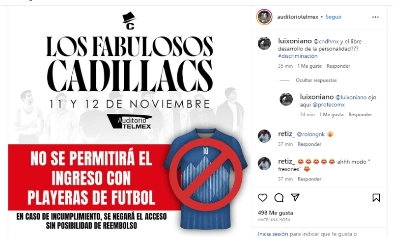 Este 11 y 12 de noviembre, los Fabulosos Cadillacs llegarán a Guadalajara con su gira "El León del Ritmo Tour". Tras casi 40 años sobre los escenarios de América Latina y algunas ciudades de Estados Unidos, el grupo originario de Buenos Aire, Argentina, anunció una serie de conciertos que ya iniciaron en México, y será este fin de semana el turno de que presenten en dos fechas su original música que mezcla el ska, reggae, rap, rock y la salsa para hacer bailar a los tapatíos.Para los conciertos, cuya venta de boletos comenzó el pasado mes de mayo, el Auditorio Telmex prohibió el ingreso con camisetas de futbol al recinto. Al menos así lo indica en una publicación en redes sociales, la cual desató comentarios por parte de los fanáticos. "@cndhmx y el libre desarrollo de la personalidad??? #discriminación", escribió el usuario @luixoniano en la publicación en Instagram.La publicación del recinto es clara y señala que en caso de incumplimiento de la medida, "se negará el acceso sin posibilidad de reembolso".*Mantente al día con las noticias, únete a nuestro canal de WhatsAppOF