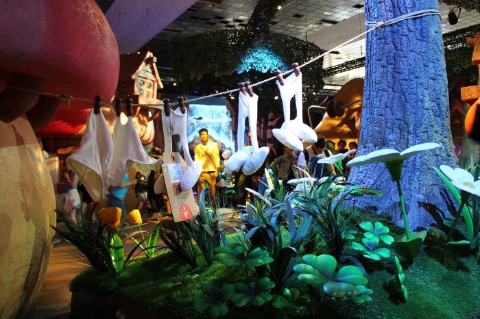 La aventura del visitante empieza en una inmensa pagina de cómic que se tiene que cruzar para adentrarse en un bosque donde mallas blancas cuelgan de hilos atados a ramas, entre flores y setas gigantes dotadas de puertas y ventanas.