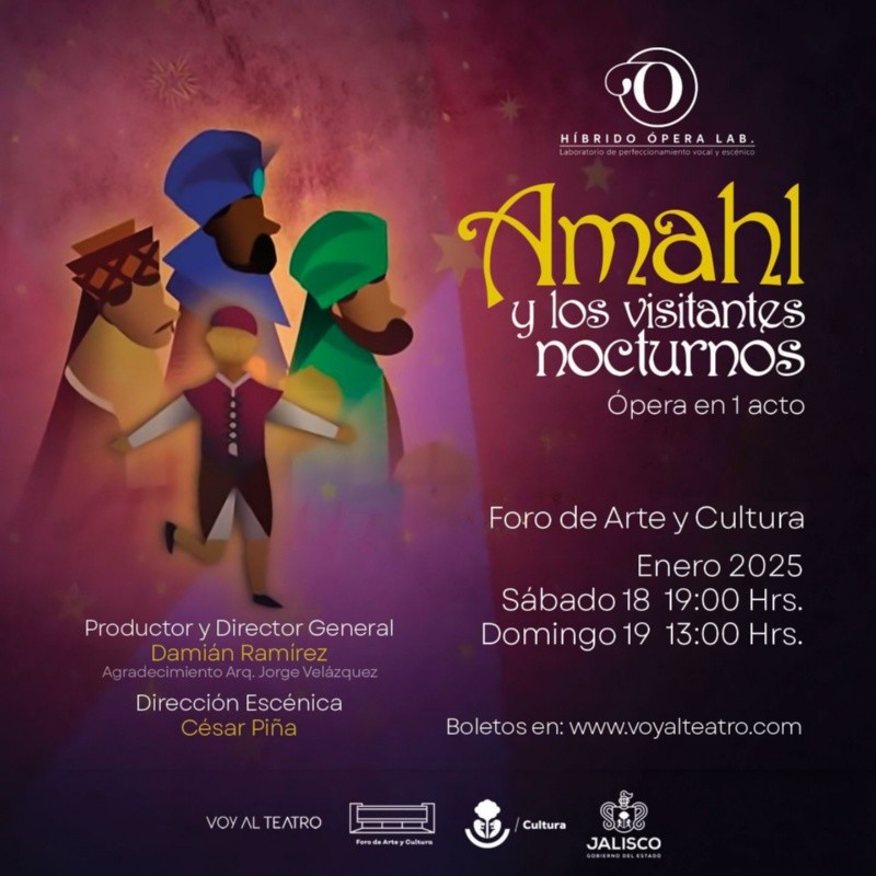 La temporada navideña en Jalisco se extenderá más allá de diciembre con la presentación de la ópera “Amahl y los visitantes nocturnos”, un espectáculo de la compañía Híbrido Ópera Lab que llenará de magia y emoción el Foro de Arte y Cultura los días 18 y 19 de enero. Esta puesta en escena es parte de la programación de la Jefatura de Espacios Escénicos de la Secretaría de Cultura de Jalisco.Bajo la dirección escénica de César Piña Rivero y acompañado por seis bailarines en escena, el montaje reinterpreta esta obra clásica de Gian-Carlo Menotti, combinando música, danza y teatro para cautivar tanto a niños como a adultos. La ópera, conocida por ser un clásico navideño, narra la historia de Amahl, un niño pobre con discapacidad que recibe la visita de tres sabios en su camino a Belén. La travesía termina con un acto de fe y milagro: Amahl, al ofrecer lo único que tiene como regalo, recupera la capacidad de caminar y acompaña a los sabios en su misión. El espíritu de esta obra no solo se refleja en su narrativa, sino también en las actividades que la acompañan. El próximo 6 de enero, de 12:00 a 16:00 horas, se llevará a cabo una jornada de donación de juguetes en el lobby del Foro de Arte y Cultura, destinada a niños y niñas en situación de vulnerabilidad. Los asistentes podrán tomarse fotografías con los Reyes Magos y disfrutar de promociones especiales para adquirir boletos de la ópera. Además, quienes donen un juguete en buen estado recibirán una cortesía infantil al compartir su experiencia en redes sociales etiquetando a @hibrido_operalabCésar Piña, arquitecto y reconocido director escénico, encabeza esta producción. Con una trayectoria que abarca ópera, teatro y televisión, Piña ha dirigido más de 30 títulos y debutó con la Ópera de Bellas Artes en 2004 con “El elixir del amor”. Las funciones de “Amahl y los visitantes nocturnos” se llevarán a cabo el 18 de enero a las 19:00 horas y el 19 de enero a las 13:00 horas. Los boletos están disponibles en voyalteatro.com, con precios de 300 y 150 pesos para espectadores frecuentes. EE