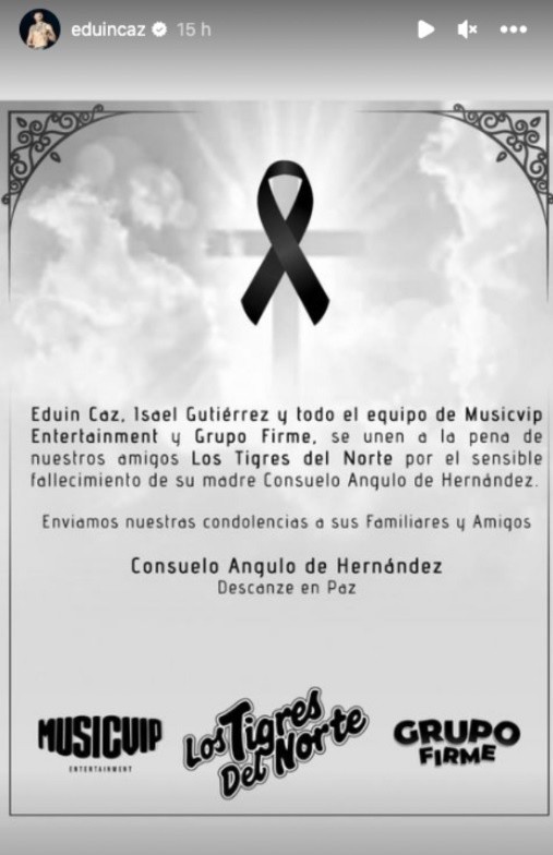 El sábado pasado los hermanos Hernández Ángulo, integrantes del grupo mexicano los Tigres del Norte pasaron por un momento complicado luego de que se enterarán que su madre Consuelo Angulo de Hernández había fallecido, esto en un concierto que estaban realizando en la ciudad de Querétaro. Tras terminar su presentación en dicha ciudad, los integrantes del grupo regional mexicano viajaron inmediatamente a Mexicali, ciudad en donde se encontraba su madre, de quien lamentablemente no alcanzaron a despedirse, pues ya había partido de este mundo.Los Tigres del Norte tuvieron que despedirse de su madre en pleno concierto, fue Hernán Hernández quien se detuvo al dar la noticia, esto mientras se encontraban interpretando el tema de "La ley del monte". "Tenemos un nudo en la garganta, nos acaban de avisar que nuestra madre falleció".El público que se encontraba en el inmueble quedó en total silencio impactados por la lamentable noticia, segundos después brindaron su apoyo incondicional a su banda preferida.Ante este lamentable suceso Eduin Caz, miembro de otra de las bandas exitosas del momento, Grupo Firme, publicó en una historia de Instagram un comunicado en el que expresó sus condolencias.En la foto en la que se ve una cruz con un listón negro se pudo leer la leyenda "Grupo Firme se une a la pena de nuestros amigos Los Tigres del Norte por el sensible fallecimiento de su madre". A este mensaje se le sumaron Isael Gutiérrez y todo el equipo de Musicvip Enternaiment. Con esto podemos ver que Eduin aún espera tener alguna relación con Los Tigres.La banda de los hermanos Hernández en el momento continuó con su show."Que siga porque ella nos decía: El público es primero", dijeron haciendo memoria a las palabras de su madre.Olegario Angulo, es el primo de Jose, Hernán, Eduardo y Luis, y es quien funciona como representante. Él aseguró que la próxima fecha programada para Los Tigres, el jueves 27 de octubre, no se cancelaría. Recordaremos a "la jefa de las jefas" cada vez que se cante alguna ranchera o balada del famoso grupo que hoy está tratando de procesar la pérdida.MF