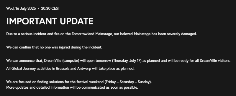 “Debido a un fuerte incendio el escenario principal del Tomorrowland resultó con daños severos. Podemos confirmar que no hay heridos por el incidente.”