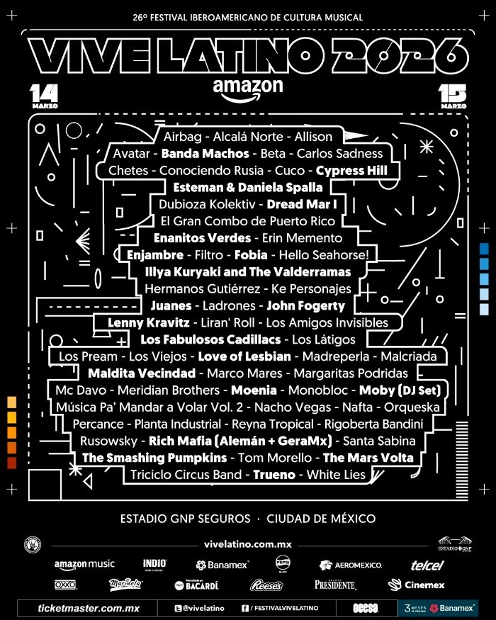 El Vive Latino 2026 reveló su lineup completo y la distribución por días para su edición número 26, que se celebrará el 14 y 15 de marzo en el Estadio GNP Seguros. El festival, uno de los eventos musicales más importantes de América Latina, reunirá a artistas internacionales, bandas históricas y proyectos emergentes que conforman la identidad sonora del encuentro.La presentación del cartel marca el inicio formal del camino hacia el VL 2026, que volverá a ofrecer dos jornadas con propuestas que abarcan rock, pop, ska, electrónica y fusiones latinoamericanas. Con una trayectoria de más de dos décadas, el festival mantiene su apuesta por combinar talentos consolidados con nuevas voces que han ganado presencia en la escena regional.Además de la publicación del lineup, los organizadores confirmaron la fecha de la preventa de boletos, que se llevará a cabo el 12 de diciembre a las 10:00 horas a través de Banamex. Con esta información, los asistentes ya pueden planear su visita y elegir entre acudir el sábado, el domingo o vivir ambos días del festival.Sábado 14 de marzoAIRBAG, Alcalá Norte, Carlos Sadness, Chetes, Cuco, Cypress Hill, El Gran Combo de Puerto Rico, Enanitos Verdes, Enjambre, Erin Memento, Filtro, John Fogerty, Juanes, Ke Personajes, Ladrones, Lenny Kravitz, Los Amigos Invisibles, Los Látigos, Los Pream, Los Viejos, Love of Lesbian, Madreperla, Maldita Vecindad, Marco Mares, Margaritas Podridas, MC Davo, Moenia, Nacho Vegas, Orqueska, Planta Industrial, Trueno y White Lies.Domingo 15 de marzoAllison, Avatar, Banda Machos, Beta, Conociendo Rusia, Esteman & Daniela Spalla, Dubioza Kolektiv, Dread Mar I, Fobia, Hello Seahorse!, Hermanos Gutiérrez, Illya Kuryaki and the Valderrama, Liran’ Roll, Los Fabulosos Cadillacs, Malcriada, Meridian Brothers, Moby (DJ set), Monobloc, Música Pa’ Mandar a Volar Vol. 2, Nafta, Percance, Reyna Tropical, Rich Mafia, Rigoberta Bandini, Rusowsky, Santa Sabina, The Smashing Pumpkins, The Mars Volta, Tom Morello y Triciclo Circus Band. Con el cartel definido y la preventa en puerta, el Vive Latino 2026 inicia oficialmente su ruta hacia una nueva edición que promete consolidar su legado como uno de los festivales más relevantes de la región. Los asistentes podrán reencontrarse con artistas emblemáticos, descubrir nuevas propuestas y vivir dos jornadas que, una vez más, buscarán capturar la energía colectiva que ha caracterizado al evento durante más de 25 años.SV