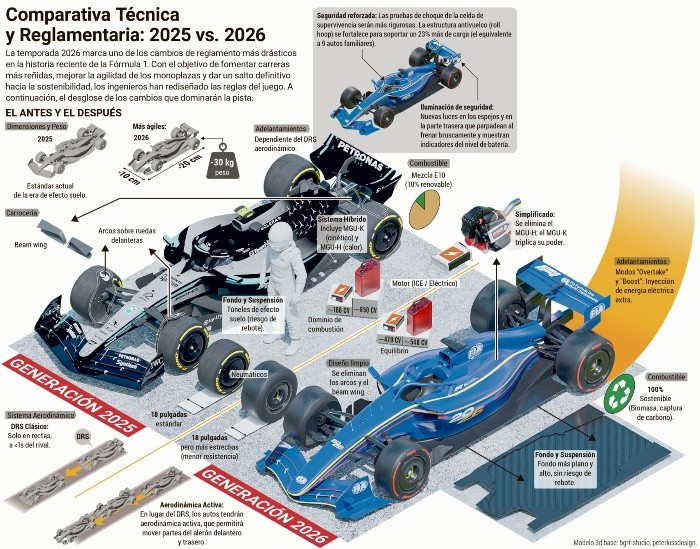 La Fórmula 1 pone en marcha la transformación técnica más ambiciosa de su era moderna. El reglamento que entra en vigor a partir de este fin de semana en Melbourne no supone una simple evolución normativa, sino un reinicio estructural que pretende equilibrar sostenibilidad ambiental, control de costos y espectáculo en pista. La Federación Internacional del Automóvil (FIA) ha diseñado un paquete técnico que redefine motor, chasis y aerodinámica. Sin embargo, la magnitud del cambio ha abierto una grieta en el paddock: ingenieros y fabricantes celebran la oportunidad tecnológica, mientras varios pilotos cuestionan el impacto en la esencia competitiva de la categoría.El cambio más radical se encuentra en la unidad de potencia. Se mantiene el bloque V6 turbo de 1.6 litros, pero la arquitectura eléctrica se expande hasta alcanzar una paridad inédita: 50% de potencia eléctrica y 50% térmica. La decisión marca un giro estratégico hacia la electrificación sin abandonar por completo el motor de combustión.La primera gran modificación es la eliminación del MGU-H, el complejo sistema que recuperaba energía de los gases de escape. La FIA argumenta que suprimirlo reducirá costos y simplificará la tecnología, facilitando la entrada de nuevos fabricantes como Audi y el regreso de Ford como socio técnico. En contrapartida, el MGU-K -encargado de recuperar energía cinética en la frenada- triplicará su capacidad, pasando de 120 kW a 350 kW. Esto significa que cerca de 470 caballos de fuerza provendrán exclusivamente del sistema eléctrico. En términos prácticos, casi la mitad del rendimiento del monoplaza dependerá de la gestión energética.A ello se suma el uso obligatorio de combustibles 100% sostenibles. Por primera vez en la historia del campeonato, los motores funcionarán sin carbono fósil, un paso decisivo en la estrategia de neutralidad climática de la categoría. La electrificación implica baterías más pesadas, por lo que la FIA ha rediseñado el concepto de chasis bajo el principio de “agilidad”. Los monoplazas son más pequeños y ligeros que los de 2025.La distancia entre ejes se reducirá de 3.6 a 3.4 metros, mientras que el ancho total pasará de dos a 1.9 metros. En teoría, autos más compactos deberían permitir luchas más cerradas.La gran novedad será la aerodinámica activa. Tanto el alerón delantero como el trasero contarán con dos configuraciones: el Modo Z, diseñado para máxima carga aerodinámica en curvas, y el Modo X, pensado para reducir la resistencia al avance en rectas. Este sistema sustituirá el tradicional DRS como herramienta principal para facilitar adelantamientos.Además, se introduce el Manual Override Mode, un impulso eléctrico adicional que el piloto perseguidor podrá activar cuando se encuentre a menos de un segundo del coche de adelante.RESERVASLas críticas más contundentes a los cambios tan radicales han surgido desde el grupo de campeones. Max Verstappen ha advertido que la elevada dependencia eléctrica podría provocar situaciones en las que los pilotos deban levantar el pie del acelerador en plena recta para recargar batería. En ciertos circuitos de alta velocidad, las simulaciones internas sugieren que los tiempos por vuelta podrían verse comprometidos.Por su parte, Lewis Hamilton ha ironizado sobre la complejidad del nuevo sistema, señalando que casi se necesitará un “doctorado en ingeniería” para gestionar los múltiples parámetros energéticos desde el volante. Fernando Alonso también ha manifestado reservas sobre el equilibrio entre espectáculo y eficiencia.LOS PODEROSOSNo todos comparten el escepticismo. En Mercedes, figuras como George Russell y el joven Kimi Antonelli confían en la capacidad técnica de la escudería para capitalizar la transición. Históricamente, los grandes cambios reglamentarios han beneficiado a estructuras con sólidos departamentos de ingeniería.En Ferrari, la postura es prudente: el foco está en maximizar el desarrollo del nuevo motor para compensar posibles limitaciones aerodinámicas. Mientras tanto, Red Bull y McLaren, además de los ya mencionados, son los favoritos tras los resultados de los test de pretemporada.La FIA, consciente de la controversia, aún dispone de margen para ajustar algunos parámetros. El objetivo declarado es claro: preservar el prestigio de la F1 como cúspide tecnológica del automovilismo, sin renunciar a la sostenibilidad.LA VOZ DEL EXPERTOJosé Antonio Cortés, analistaLa revolución reglamentaria de 2026 en la Fórmula 1 ha encendido el debate dentro y fuera del paddock. Para el analista José Antonio Cortés, la molestia de varios pilotos tiene una raíz clara: el cambio transforma la esencia misma de cómo se conduce un coche.“Los autos ahora serán 50% eléctricos y 50% de combustión interna. Eso modifica por completo la filosofía”, explica Cortés. “A la nueva unidad de potencia se suman la aerodinámica activa y un sistema de adelantamiento que sustituye al DRS por un esquema de energía extra disponible cuando el piloto está a menos de un segundo del rival, además de un botón de ‘boost’ que exige recuperación constante durante la carrera”.Según Cortés, figuras como Max Verstappen, Fernando Alonso y Lewis Hamilton, resienten que el enfoque ya no sea ir siempre al límite. “Ellos están acostumbrados a llevar el auto al máximo en cada vuelta. Ahora no se trata solo de ser el más rápido, sino de gestionar energía y estrategia. Y sienten que eso le resta pureza al automovilismo”.La comparación con la Fórmula E es inevitable. Incluso preocupa que, en ciertos escenarios, los autos sean más lentos que un F2.No todos lo ven igual. Charles Leclerc ha sido menos crítico, mientras que George Russell y Kimi Antonelli observan oportunidades, especialmente si Mercedes capitaliza el nuevo reglamento, tal y como avisó en la pretemporada.Para Cortés, todo depende del cristal con que se mire. Los grandes
