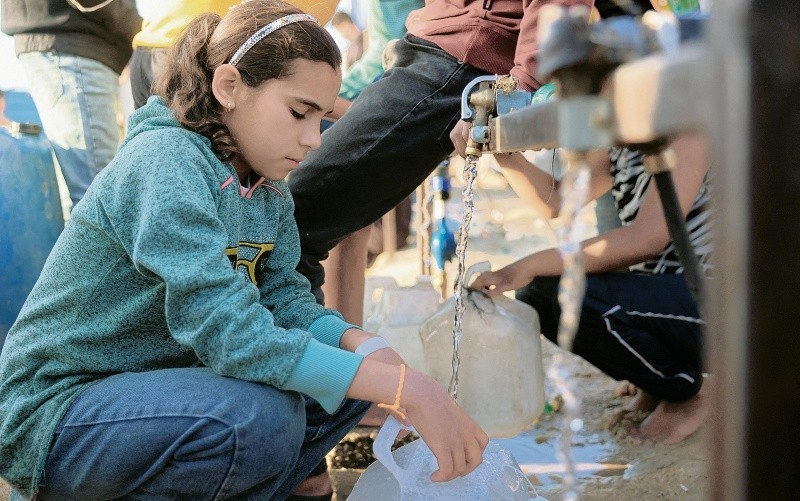 Gaza. Una niña espera paciente a llenar un recipiente con agua. La falta de insumos básicos se agudiza entre la población palestina. AFP