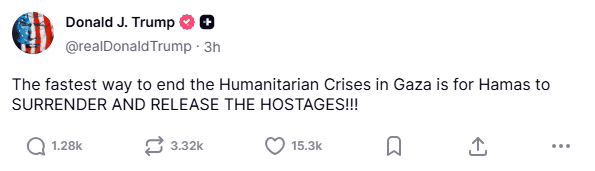 Donald Trump aseguró este jueves que la forma “más rápida” de resolver la crisis en la Franja de Gaza es la rendición absoluta del grupo militante palestino Hamás y la devolución de los rehenes israelíes. Las declaraciones se enmarcan en medio de un creciente reclamo por mejorar las condiciones en el enclave palestino."¡La manera más rápida de poner fin a la crisis humanitaria en Gaza es que Hamás SE ENTREGUE Y LIBERE A LOS REHENES!", escribió el mandatario en su red Truth Social.Las declaraciones de Trump se producen durante la visita a Jerusalén del enviado especial estadounidense para Oriente Medio, Steve Witkoff, quien se reunirá con altos cargos israelíes para abordar la situación en la Franja, donde en los últimos días las autoridades locales han denunciado un pico de muertes relacionadas con el hambre.El mandatario ha expresado ya la necesidad de poner fin al conflicto en Gaza y su país sirve de mediador en las negociaciones indirectas en Doha entre Hamás y el Ejecutivo del primer ministro israelí, Benjamín Nentayahu.Actualmente este diálogo muestra signos de estancamiento después de que la semana pasada las delegaciones estadounidenses e israelíes se retiraran al considerar que a Hamás le falta voluntad para lograr una tregua.Sin embargo, el lunes pasado Trump señaló que ve posible un alto el fuego y reconoció que hay hambruna en Gaza porque ve "a niños hambrientos" en televisión.El presidente estadounidense habría enviado a Witkoff para indagar más sobre la situación humanitaria en Gaza y así decidir cómo llevar más ayuda a los civiles, informó el medio digital Axios.Según medios israelíes, se prevé que el enviado especial estadounidense se traslade a uno de los puntos de distribución de comida de la polémica Fundación Humanitaria para Gaza (GHF, en inglés), apoyada por Estados Unidos pero duramente criticada por la ONU y otros organismos internacionales por obligar a los gazatíes a desplazarse a zonas peligrosas para conseguir comida.* * * Mantente al día con las noticias, únete a nuestro canal de Whatsapp * * *OB