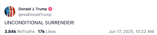 El presidente de Estados Unidos, Donald Trump, pidió la "rendición incondicional" de Irán luego de haber tomado control del espacio aéreo de dicho país y asegurar conocer la locación de Alí Jamaneí, líder supremo iraní. Los contundentes mensajes fueron compartidos a través de su perfil oficial de Truth Social.El primero de ellos, publicado hace una hora, dice lo siguiente:"Hemos tomado el control total del espacio aéreo sobre Irán. Irán tiene equipo defensivo poderoso y en grandes cantidades, pero nada en comparación con lo diseñado, concebido y hecho en Estados Unidos. Nadie lo hace mejor que el viejo EUA."El siguiente mensaje fue direccionado contra Alí Jamaneí, líder supremo iraní, en donde habló de la posibilidad de acabar con su vida:"Sabemos exactamente dónde se esconde el llamado 'Líder Supremo'", añadió Trump. "Es un objetivo fácil, pero está seguro allí. No vamos a eliminarlo (¡matarlo!), al menos no por ahora. Pero no queremos misiles disparados a civiles o soldados estadounidenses. Nuestra paciencia se está agotando".Por último, el presidente Trump exigió en mayúsculas y con exclamativas la "¡RENDICIÓN INCONDICIONAL!" de Irán, tras cinco días de escalamiento en el conflicto.Trump regresó a la Casa Blanca de su visita abreviada a la cumbre del G7 canadienses el martes temprano, en un momento decisivo de su presidencia. Israel, con cinco días de ataques con misiles, ha causado un daño considerable a Irán y cree que ahora puede asestar un golpe permanente a su programa nuclear especialmente si recibe un poco más de ayuda del presidente republicano.El presidente de Estados Unidos señaló que ahora buscaba "un verdadero fin" al conflicto y una "rendición completa" del programa nuclear de Teherán. "Deberían haber hecho el trato. Les dije, 'Hagan el trato'", declaró Trump a los periodistas en el Air Force One. "Así que no sé. No estoy muy dispuesto a negociar".Trump, quien planeaba reunirse con asesores en la Sala de Crisis, parece estar construyendo gradualmente el caso público para un papel estadounidense más directo en el conflicto. Su cambio de tono se produce cuando Estados Unidos ha reposicionado buques de guerra y aviones militares en la región para responder si el conflicto entre Israel e Irán se intensifica aún más.Con información de AP* * * Mantente al día con las noticias, únete a nuestro canal de Whatsapp * * *OB