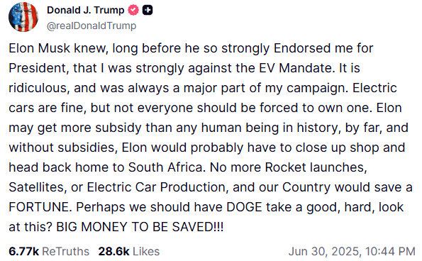 "Elon Musk sabía, mucho antes de apoyarme con tanta vehemencia como presidente, que me oponía firmemente al mandato de vehículos eléctricos. Es ridículo, y siempre fue una parte importante de mi campaña. Los coches eléctricos están bien, pero no todo el mundo debería estar obligado a tener uno", dice Trump.
