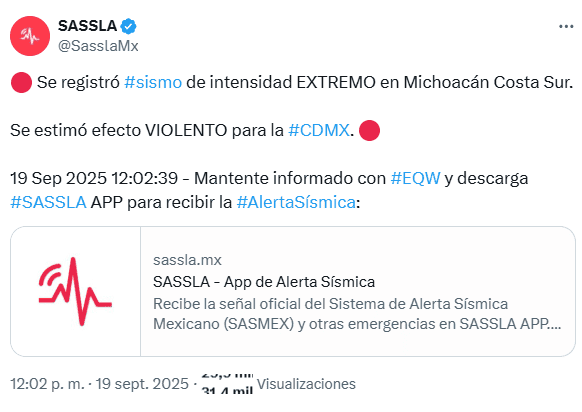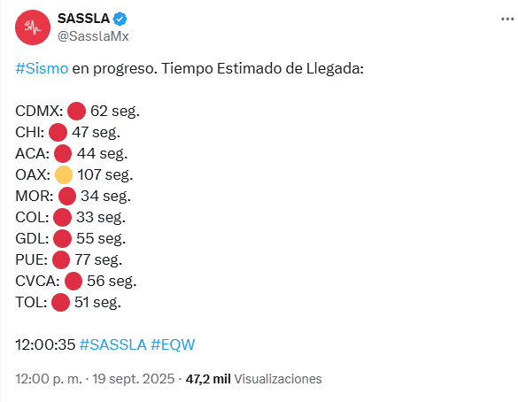 Este viernes 19 de septiembre, en punto de las 12:00 horas, tapatíos fueron sorprendidos por el sonido de la alerta sísmica durante el segundo Simulacro Nacional 2025. Este ejercicio, que se organiza cada año en México, busca reforzar la cultura de la protección civil y promover la preparación de la ciudadanía ante posibles emergencias. La finalidad es crear conciencia sobre la importancia de saber cómo actuar frente a situaciones inesperadas, no obstante, en esta ocasión destacó la novedad de escuchar por primera vez la alarma sísmica en Jalisco, un detalle que llamó la atención de los participantes.Aunque el Gobierno de México informó con anticipación que el Simulacro Nacional incluiría la activación de una alerta sísmica a nivel nacional, diseñada para llegar a más de 80 millones de celulares sin necesidad de conexión a Internet, en Jalisco muchos habitantes se llevaron un susto. Algunos desconocían la prueba y otros, aun sabiendo de ella, no la recordaban, por lo que se sorprendieron al recibir el mensaje en sus teléfonos móviles justo al inicio del ejercicio. Cabe recordar que esta herramienta ya había sido evaluada por primera vez en el simulacro realizado en abril pasado en la Ciudad de México.La coordinadora nacional de Protección Civil, Laura Velázquez Alzúa, explicó que los teléfonos móviles recibirían un mensaje acompañado de un sonido de alarma. El texto decía: "ESTO ES UN SIMULACRO, este es un mensaje para probar la funcionalidad del Sistema Nacional de Alertas del Gobierno de México, ESTO ES UN SIMULACRO". En efecto, ese fue el mensaje que se recibió en los celulares, acompañado de la aclaración de que correspondía a una alerta presidencial. Para poder ver en las pantallas la alerta no era necesario instalar aplicaciones adicionales ni contar con conexión a Internet, ya que el sistema de alertamiento en México funciona de manera gratuita y es compatible con redes móviles 2G, 3G y 4G.Durante el Simulacro Nacional de hoy, la Plataforma Digital de Alertamiento y Gestión Integral de Riesgos (SASSLA) también efectuó el disparo de la alerta sísmica a través de su aplicación móvil y la notificación a través de su cuenta de X (antes Twitter).SASSLA es una app de monitoreo de sismos en tiempo real en México; esta avisa hasta 120 segundos antes de un sismo, e indica qué tan fuerte se sentirán, así como en cuánto tiempo. También se puede descargar gratis para Android y iOS.La página de la app dice que retransmite la señal oficial del Sistema de Alerta Sísmica Mexicano (SASMEX).El detalle fue que el mensaje de esta ocasión no especificaba que se trataba de una alerta por simulacro, lo que confundió a algunos usuarios.También la aplicación Sky Alert avisó con un mensaje, sin embargo, contrario a lo que hizo SASSLA, ésta sí avisó que se trataba de un simulacro.*Mantente al día con las noticias, únete a nuestro canal de WhatsAppOF