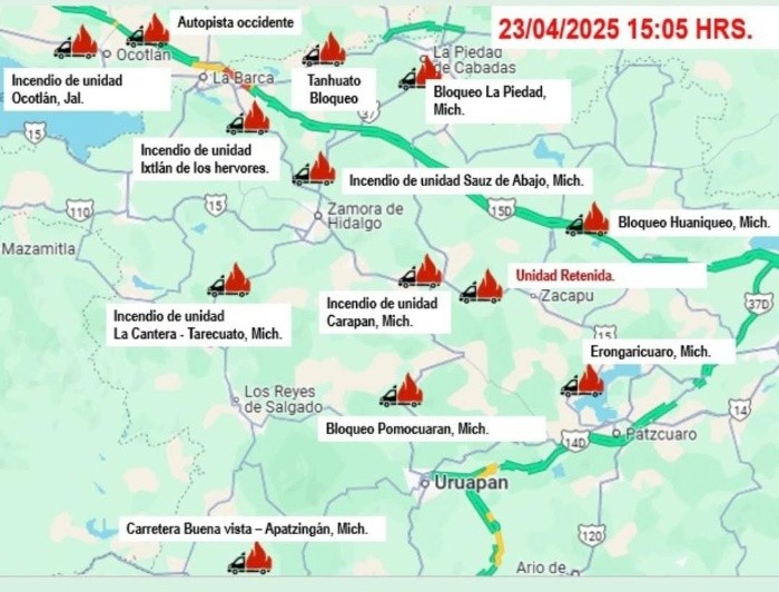 Luego de una balacera iniciada en Michoacán, se registraron quema de vehículos y tiendas de conveniencia, además de bloqueos en carreteras en al menos cinco regiones de la entidad.Hasta la tarde de este miércoles, las autoridades estatales de seguridad, reportaron la quema simultánea de 15 vehículos en distintos tramos carreteros de las regiones de Apatzingán, La Piedad, Zamora, Zacapu, Morelia y Pátzcuaro.También se registraron bloqueos e incendios de unidades en Ocotlán, Jalisco.Además, se reportan enfrentamientos también sobre la carretera Morelos-México, a la altura de Contepec, donde los criminales también le prendieron fuego a un vehículo.En Apatzingán se mantienen cerrados todos los Oxxos y además suspendieron el servicio del transporte público. En Uruapan, también reportan cerrados todos los Oxxos.Mediante comunicado, la Secretaría de Seguridad Pública de Michoacán, informó que personal a su cargo, así como de la Defensa Nacional (Defensa), y de la Guardia Nacional (GN), desplegaron diversas acciones operativas en distintos puntos de la entidad para atender los bloqueos carreteros ocasionados por grupos delincuenciales en respuesta a las acciones que se desarrollan en materia de seguridad.La dependencia estatal, dijo que las acciones operativas se han reforzado en las regiones de Zamora, Zacapu, Apatzingán, La Piedad, Pátzcuaro y Morelia a fin de dar con los responsables de estos hechos y garantizar la integridad de la población.El sistema de videovigilancia estatal C5 de Michoacán, pidió evitar circular por las siguientes zonas:-Carretera Uruapan–Carapan (a la altura de Carapan).-Uruapan-Pátzcuaro, a la altura de San Andrés Corú.-Carretera Uruapan - Los Reyes, a la altura de la comunidad de San Lorenzo.-San Andrés Ziróndaro y Santa Fe de la Laguna.-Carretera Pátzcuaro-Erongarícuaro.-Entrada a Tiríndaro, municipio de Zacapu.-Autopista Occidente KM280 en Huaniqueo.-Autopista Maravatío-Atlacomulco KM142.-Carretera Morelia-Guadalajara KM65.-Carretera libre entre Vista Hermosa y Yurécuaro.-Carretera La Piedad-Zamora a la altura del CERESO.-Carretera Apatzingán-Buena Vista, a la altura de la desviación al “Recreo”.-Municipio de Apatzingán.-Carretera Zitácuaro-Morelia, desviación Jungapeo.-Av. Morelos Norte y Libramiento en Morelia.-Purépero-La Piedad, a la altura del lugar conocido como el "Rancho Los Carichi".-Carretera Atlacomulco-Zapotlanejo, a la altura de Copándaro.-Carretera Zamora-La Piedad, a la altura de Ecuandureo. NA