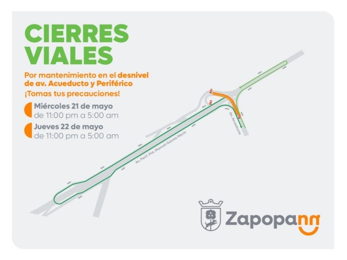 El Gobierno de Zapopan anunció que este miércoles 21 y jueves 22 de mayo habrá un cierre parcial en el desnivel de la Avenida Acueducto y Periférico, esto con motivo de labores de mantenimiento en la zona.Los cierres serán durante la noche en los siguientes horarios: Miércoles 21 de mayoJueves 22 de mayoEl cierre temporal solo será en el desnivel por lo que te recomendamos tomar tus precauciones, algunas de las vías alternas son:NA
