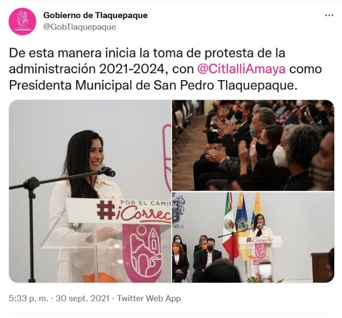 Durante su toma de protesta este jueves, Citlalli Amaya dijo estar lista para tomar la estafeta por Tlaquepaque en la administración que comenzará a partir de mañana hasta el 30 de septiembre del 2024.Con el hashtag #PorElCaminoCorrecto, comenzó la toma de protesta de Mirna Citlalli Amaya a las 17:00 horas en el Centro Cultural El Refugio, según bajo la legalidad de la resolución del consejo general del Instituto Electoral de Participación Ciudadana del Estado de Jalisco.“Hoy tomo la estafeta de un gobierno que cambió la historia de Tlaquepaque para siempre, a través de nuestras acciones que se hable durante todo el tiempo, que cuando se hable de este capítulo de la historia de San Pedro Tlaquepaque se diga que nosotros fuimos una administración que trabajó, que rompió paradigmas y que hizo de Tlaquepaque un mejor lugar para todos, que se diga que nosotros fuimos la administración que hizo mejores vialidades, que cuidamos de las finanzas sanas, que hoy estamos recibiendo, que impulsamos áreas recreativas y unidades deportivas para nuestros niños y para nuestros jóvenes, que transformamos nuestras escuelas y nuestros modelos educativos, que posicionamos en nuestro municipio como un destino turístico a nivel internacional y que hubo más inversión pública”, señaló Amaya, agradecida con su antecesora María Elena Limón.Amaya de Luna invitó a empresarios a que sigan invirtiendo en Tlaquepaque, ya que tendrán la mejor apertura administrativa sin tanta burocracia y además invito a la oposición a unirse por el bienestar de la ex villa alfarera.“Seguiremos trabajando fuerte con los empresarios en Tlaquepaque, estamos listos para recibir sus inversiones, por nuestra parte haremos más ágiles todos aquellos trámites que conlleva la administración pública, siempre apegados a transparencia y rendición de cuentas, así con plena certeza le reitero que en Tlaquepaque estamos listos para recibir sus inversiones, y a quien le toca jugar el rol de oposición los invito hacer equipo con este gobierno de unidad, así que unámonos por los ciudadanos de Tlaquepaque, para ir juntos en el camino que todas y todos deseamos para vivir en paz y en armonía”, recalcó.Por su parte la presidenta saliente interina, Betsabé Almaguer, destacó el trabajo de María Elena Limón y exigió a Citlalli que cumpla con las expectativas y seguimiento de la administración 2018-2021.“Ahora entiendo a cabalidad y profundidad, en lo público y hasta en lo privado lo que se logró y en todo ello contribuyó María Elena Limón, por eso le extiendo hoy también a nombre de todas y todos aquellos que recibieron respuesta y ayuda y del mío propio un reconocimiento a la presidenta, que lejos de descansar hoy es diputada federal y sigue viendo por Tlaquepaque a María Elena limón que la historia juzgará favorablemente y hoy le decimos de todo corazón: gracias, dejaste huella en Tlaquepaque, ahora llega una nueva etapa, más laboriosa para mi amiga Citlali Amaya, próxima presidenta municipal electa por voluntad mayoritaria, viene a construir algo que ya tiene cimientos colocados por la que fue la presidenta municipal constitucional María Elena Limón y tendrá que superar lo pasado, Citlali abiertamente y de todo corazón el mayor de los éxitos”, apuntó.Si te interesó esta noticia y quieres saber más, entonces descarga y descubre INFORMAPlus, la aplicación digital de EL INFORMADOR, en donde tenemos contenidos exclusivos, seleccionados por nuestros editores, para darles una experiencia más completa a los lectores. Si eres suscriptor de EL INFORMADOR tu acceso está incluido, solicítalo al 33 3678-7777.Descarga la aplicación y pruébala GRATIS por treinta días.Para iOS: https://apple.co/35jaVgbPara Android: https://bit.ly/3gwVSEVJM
