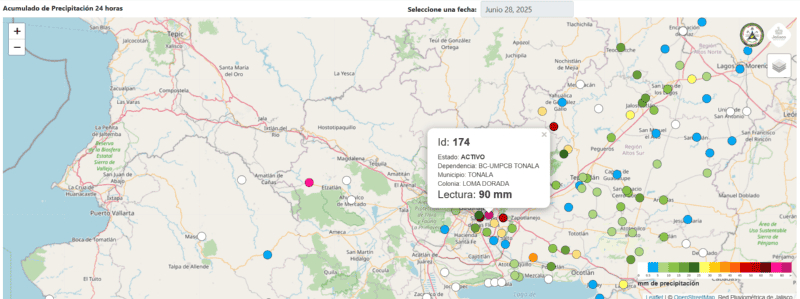 El municipio que más agua recibió por la lluvia sabatina de acuerdo con el monitoreo de Acumulado de Precipitación de 24 horas realizado por la Unidad Estatal de Protección Civil y Bomberos de Jalisco a través de la Red Pluviométrica del estado fue Tonalá con una caída puntual de 90 milímetros de agua medidos en Loma Dorada.