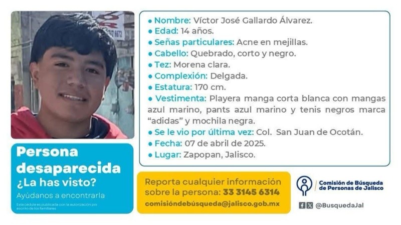 Víctor José, de 14 años de edad y alumno de secundaria, desapareció ayer por la mañana, cuando salió de su casa para ir a la escuela y ya no regresó. Desde entonces no se sabe nada de él, por lo que familiares y amigos se manifestaron esta tarde en Periférico a su cruce con la calle Ocampo, a la altura de la estación San Juan de Ocotán de Mi Macro Periférico, para exigir su localización.La Comisión de Búsqueda de Personas del Estado de Jalisco publicó su ficha hoy por la mañana. En tanto, familiares convocaron a la manifestación en redes sociales, misma que comenzó alrededor de las 18:00 horas. Cerca de una hora y media después se reabrió la circulación vehicular en dirección a Avenida Vallarta.Víctor lleva el uniforme de educación física de su escuela, playera manga corta blanca con mangas azul marino, pants azul marino, tenis negros y una mochila negra. Es de complexión delgada, tez morena y mide 1.70 metros. Fue visto por última vez en la colonia San Juan de Ocotán, en Zapopan. De acuerdo con cifras del Registro Estatal de Personas Desaparecidas, hasta el 28 de febrero en Jalisco había 15 mil 426 personas desaparecidas.MF