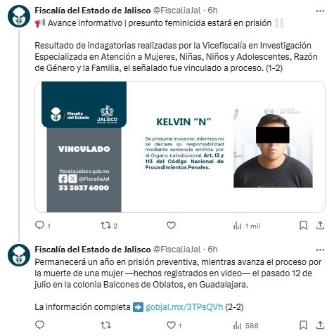 Kelvin “N”, señalado como el presunto feminicida de Karla en Guadalajara y detenido por las autoridades de Jalisco el 21 de julio de 2025, fue vinculado a proceso este martes 22 del mismo mes. Como medida cautelar, se le impuso prisión preventiva oficiosa por un periodo de un año.El crimen de Karla, una joven de 28 años, generó una fuerte indignación entre la población de Jalisco y en redes sociales, luego de que se viralizara un video que muestra el momento exacto del ataque el domingo 13 julio, en el cruce de las calles Hacienda a Los Cedros y Hacienda de Calderón, en la colonia Residencial Plutarco Elías Calles, en sus límites con Balcones de Oblatos. Al día siguiente, por la tarde, las autoridades informaron que lograron encontrar el vehículo en el que escapó el agresor en un domicilio de Tlajomulco de Zúñiga.En un inicio, trascendió que el agresor podría haber sido su pareja sentimental. Sin embargo, los familiares de la víctima desmintieron esta versión. Según el reporte de la Fiscalía del Estado, Kelvin “N” tiene 24 años y se presume que se dedica al oficio de mecánico. Además, medios locales han informado que el detenido cuenta con antecedentes penales, incluyendo acusaciones previas por corrupción de menores y abuso sexual. Aunque fue vinculado a proceso por esos delitos, obtuvo su libertad debido a la falta de pruebas contundentes. La captura se llevó a cabo en un domicilio de la colonia Loma Dorada, en el municipio de Tonalá, como parte de un operativo coordinado por la Unidad de Investigación Especializada en Feminicidios de la Vicefiscalía en Investigación Especializada en Atención a Mujeres, Niñas, Niños y Adolescentes, Razón de Género y la Familia. EE