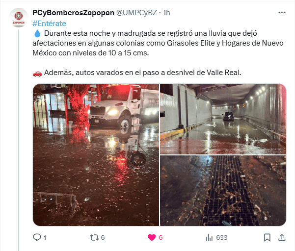 Durante la madrugada de este martes, una fuerte lluvia se hizo presente en el Área Metropolitana de Guadalajara (AMG), en las localidades de Zapopan, Tlaquepaque, Tonalá y Tlajomulco de Zúñiga.Esta representa la primera lluvia de gran intensidad del temporal y dejó a su paso diversas afectaciones.A través de sus redes sociales, Protección Civil y Bomberos de Zapopan reportaron que por la lluvia, autos quedaron varados en el paso a desnivel de Valle Real.Además, se registraron niveles de 50 cm en el paso a desnivel de Periférico y la Avenida 5 de mayo, al igual que en el paso a desnivel de la Avenida Ávila Camacho.En López Mateos, a la altura de la Unidad Administrativa, también se llevaron a cabo maniobras para retirar el agua. El Gobierno de Tonalá informó que se atendieron diversas incidencias en el municipio por la lluvia, en colonias como Tonalá Centro, Loma Dorada, Colonia Jalisco, El Molino, Paseos de Tonalá, Coyula, Lomas del Manantial, 20 de Noviembre, Misión San Francisco e Infonavit La Soledad.Hubo encharcamientos, árbol y bardas caídas, vehículos varados y personas en riesgo de arrastre. No se reportaron personas lesionadas. Hasta el momento, las autoridades de otros municipios del AMG no han presentado un corte definitivo de las afectaciones por la lluvia de ayer.* * * Mantente al día con las noticias, únete a nuestro canal de WhatsApp * * *MB