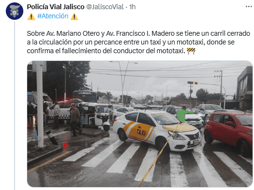 La mañana de este jueves, un mototaxi y un taxi tradicional, de los llamados "amarillos", protagonizaron un choque que derivó en la muerte del conductor del motocarro.La Policía Vial informó que recibió una alerta por un percance vial en el cruce de Mariano Otero y Francisco I. Madero, en los límites de las colonias Santa Ana Tepatitlán y Arenales Tapatíos, zona frecuente de paso de los mototaxis.Ahí los oficiales encontraron que el taxi y el mototaxi habían impactado, sin que hasta el momento se tenga mayor información sobre cómo ocurrieron los hechos, dejando como saldo al fallecido ya mencionado.El conductor del taxi "amarillo" quedó en calidad de retenido mientras se realizan las investigaciones pertinentes, informó la Policía Vial.Derivado de este percance, se mantiene cerrada a la circulación en al menos uno de los carriles centrales, por lo que se reporta fuerte carga vehicular sobre la avenida Mariano Otero, de modo que se recomienda a las personas conductoras prever sus traslados con antelación.El cuerpo del conductor del motocarro será llevado a las instalaciones del Instituto Jalisciense de Ciencias Forenses (IJCF), donde se le practicará la autopsia de ley y permanecerá hasta que sea reconocido oficialmente por sus familiares.Los hechos fueron turnados al ministerio público de la Fiscalía Estatal para que se encargue del análisis de los hechos y la recabación de indicios en espera de determinar responsabilidades.* * * Mantente al día con las noticias, únete a nuestro canal de WhatsApp * * *MB