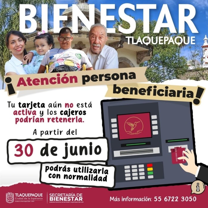 Las y los beneficiarios de los programas Bienestar Tlaquepaque podrán hacer uso de sus tarjetas en los cajeros automáticos de cualquier institución bancaria a partir del 30 de junio y disponer de su apoyo bimestral correspondiente al periodo de mayo-junio.De acuerdo con el Gobierno de San Pedro Tlaquepaque las tarjetas que se activarán a partir del próximo lunes 30 de junio son las de los siguientes programas:“Mujeres Líderes de Esperanza” y “Bienestar Incluyente”: Quienes estén inscritos a estos programas recibirán un apoyo económico de 2 mil 500 pesos. “Raíces de Esperanza”: El pago es de 18 mil pesos anuales para las y los artesanos del municipio.Cabe destacar, que las tarjetas del Bienestar Tlaquepaque aún no se encuentran activas, por lo que el Ayuntamiento alertó que, de intentar cambiar el NIP o cualquier otro uso antes de la fecha mencionada, podrían ser ser retenidas en los cajeros automáticos, ya que se bloquearían por completo.Por otro lado, quienes no han recogido sus tarjetas tienen de plazo este lunes 23 y martes 24 para acudir por estas a la Secretaria del Bienestar que se ubica en la Pila Seca, en Boulevard Marcelino García Barragán, en la colonia Prados del Nilo.Para reportes o información sobre el uso de la tarjeta, pueden comunicarse al número 55 6722 3050.NA