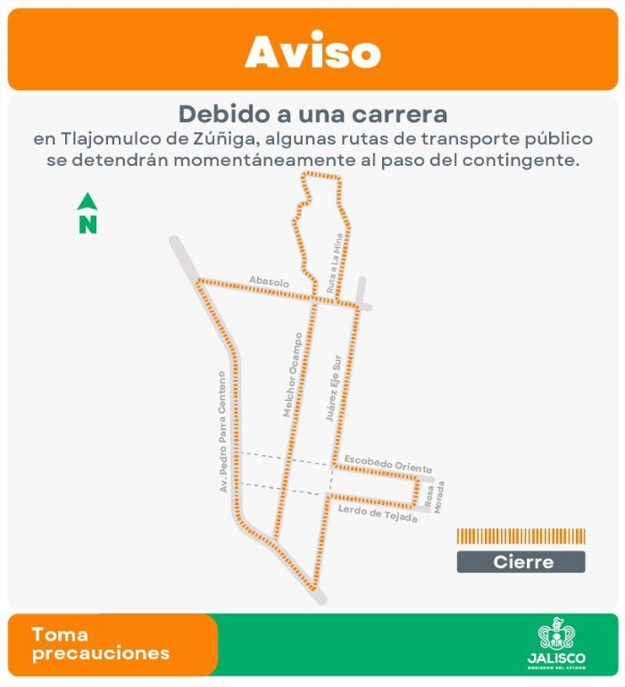 La Secretaría de Transporte Jalisco informó que el próximo domingo 22 de junio varias rutas de camiones detendrán sus recorridos en el municipio de Tlajomulco de Zúñiga, con motivo de la carrera Serial de Atletismo 5K y 10K.