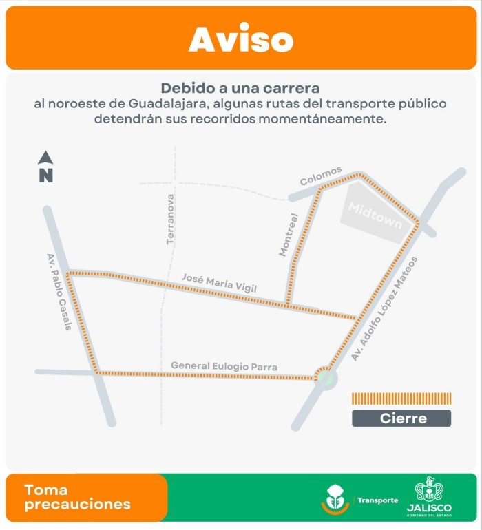 La Secretaría de Transporte Jalisco informó que el próximo domingo 28 de septiembre varias rutas de camiones detendrán y otras modificarán sus recorridos a partir de las 6:30 de la mañana en la Zona Metropolitana de Guadalajara (ZMG) debido a dos carreras deportivas.La primera carrera se realizará en el municipio de Guadalajara por lo que se cerrará la Avenida de los Maestros y la calle Sierra Nevada. Mientras que el segundo evento deportivo será en Zapopan, se cerrará Avenida Patria y Paseo Andares. Por su parte, la última carrera será en Guadalajara, donde se cerrará la Avenida Adolfo López Mateos, General Eulogio Parra, José María Vigil, Montreal, Colomos y la Avenida Pablo Casals. C54, C119 Circuito, C108, T18 López Mateos /Minerva y V03 de la Ruta López Mateos, C120, C121A, C121B, C136, C54, C71, T15-C06 Andares, T17, T17-1 y T17-C01, C64, C65, C69, C16, C21 y A07 de Mi Macro Periférico, C11, C107 y123-V2.C23, C39-V2 La Punta – Hospital Civil, C124 y T13C Centro Médico.NA