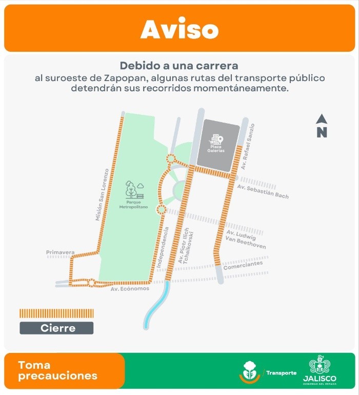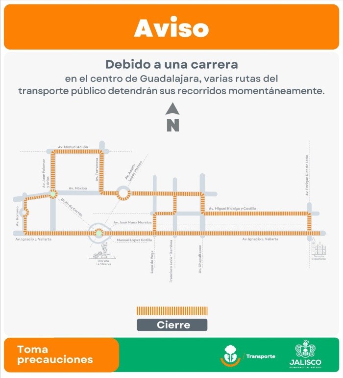 La Secretaría de Transporte Jalisco informó que el próximo domingo 19 de octubre algunas rutas de camiones pararán y otras modificarán sus recorridos a partir de las 6:30 de la mañana en la Zona Metropolitana de Guadalajara (ZMG) con motivo de dos carreras deportivas.La primera carrera se realizará en el Centro Histórico de Guadalajara y se cerrarán las siguientes vialidades: Avenida Juan Palomar y Arias, Avenida Manuel Acuña, Avenida Terranova, Avenida Homero, Avenida Miguel Hidalgo y Costilla, Avenida Ignacio L. Vallarta.Mientras que la segunda carrera se realizará en el municipio de Zapopan, por ello habrá cierres viales en: Misión San Lorenzo, Avenida Ecónomos, Independencia, Avenida Rafael Sanzio y la Avenida Piotr Ilich Tchaikovsk.C70, C74, C79, C104, C109, C110 dos vías, C121-A, C121-B, C123-V1, C123-V2, C124, C108, Mi Transporte Tren Ligero (SITREN) L1 y L3, T18 López Mateos, T18 Terranova, V02 y V03 de la Ruta López Mateos, C01, C54, C81 crucero de la Mesa, C107, C119 Circuito, T06-2 y T18 Terranova, C104, C120, T08-C01 y T17A. C17, C139, C140, V02 de la Ruta López Mateos, T07-C01 y T07-C04.NA