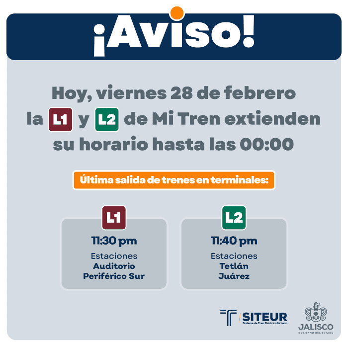 El Sistema de Tren Eléctrico Urbano informó que este viernes 28 de febrero las líneas 1 y 2 de Mi Tren extenderán sus horarios hasta las 00:00 horas, debido a que se realizará un festival en la Concha Acústica del Parque Agua Azul, como parte de las celebraciones por el 483 aniversario de la fundación de Guadalajara.Las últimas salidas en trenes serán las siguientes: Cabe destacar que la línea 3 del Tren Ligero, no tendrá cambios en sus horarios. Bajo el lema “Viva la Concha: 483 años de amor por la ciudad - CUCA 35” el grupo de rock tapatío CUCA, ofrecerá un concierto gratuito en la Concha Acústica del Parque Agua Azul a las 19:00 hrs de este viernes. NA
