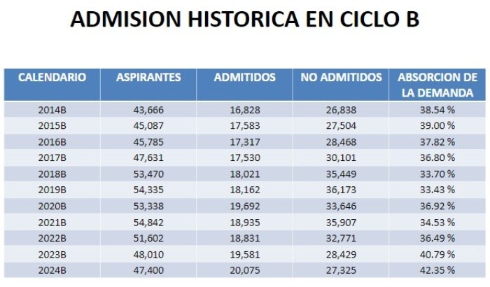 Este miércoles, la Universidad de Guadalajara dio a conocer los resultados de las listas de admisión para el calendario 2024-B, tanto a nivel preparatoria, como licenciatura, donde este ciclo se admitieron a más estudiantes.Para el próximo calendario, que arranca clases el próximo lunes 12 de agosto, fueron admitidas 20 mil 075 personas quienes concluyeron sus trámites en tiempo y forma, lo que representa alrededor de 500 admisiones en más en comparación con el ciclo 2023-B, cuando se admitieron a 19 mil 587 aspirantes, según las cifras dadas a conocer este día por la coordinadora General de Control Escolar de la UdeG, Laura Puebla Pérez.El 40.9% de las aspiraciones hechas a licenciaturas presenciales fueron admitidas, mientras que en el caso de licenciaturas en modalidad virtual se admitió al 92.8% de quienes se postularon por un espacio.En el caso de técnico superior universitario se admitió al 72.8% y al 100% de las aspiraciones que postularon por alguna carrera en técnico o técnica especializados.En total aplicaron 47 mil 400 personas aspirantes, por lo que el porcentaje total de estudiantes admitidos fue de 42.35%, siendo el récord de admisión más alto para un calendario B. Sin embargo, y por otra parte, las aspiraciones no habían sido tan bajas desde 2017, cuando se registraron 47 mil 631 personas aspirantes.De acuerdo con la coordinadora General de Control Escolar de la UdeG, si bien se ha logrado incrementar el porcentaje de personas admitidas para el segundo calendario de admisión, se ha identificado que hay personas quienes, al no ser admitidas en alguno de los ciclos abiertos semestralmente, en lugar de reintentar el ingreso desisten en el proceso de ser admitidas y optan por trabajar en lugar de continuar su carrera universitaria.Ante ello, Puebla Pérez, envió un mensaje a todas y todos los aspirantes a que no desistan y continúen aplicando a alguna carrera universitaria, y repensando en la necesidad de contar con especialistas más allá de las carreras más demandadas, y sobre todo, contemplando que se han abierto nuevas licenciaturas enfocadas a los retos de la actualidad, como lo fueron las licenciaturas aperturadas en el Centro Universitario Guadalajara (CUGuadalajara), donde se ofertan ya carreras enfocadas, por ejemplo, a la Inteligencia Artificial y Ciberseguridad.En este sentido, la carrera con mayor demanda sigue siendo la de Médico Cirujano y Partero, con más de siete mil postulaciones, pero solo 912 admisiones. Le sigue la carrera de Psicología con más de dos mil 669 postulaciones y solo 746 admisiones, así como Cirujano Dentista, a la cual postularon dos mil 340 personas, pero solo 235 fueron admitidas.Entre las carreras con menos demanda se encontraron Licenciatura en Música con orientación en Canto, con solo dos aspirantes, Licenciatura en Música con orientación en Dirección Coral y Técnico Superior Universitario en Procesos de Manufactura.Por otra parte, existen campus que mantienen cupos en sus carreras, por lo que aún es posible solicitar un cambio de aplicación este 07 y 08 de agosto, siempre y cuando exista disponibilidad en los centros universitarios.Algunas carreras con cupos son las licenciaturas en Biología, en Negocios, Estudios Políticos y de Gobierno, Logística y Transporte, Turismo, entre muchas otras opciones.Para consultar todas las carreras con espacio disponible puedes acceder aquí: http://www.escolar.udg.mx/sites/default/files/CUPOS DISPONIBLES 2024 B CENTROS.pdf27 mil 715 mujeres compitieron por un espacio para este calendario escolar, así como 19 mil 614 hombres.Esta es la primera vez que se identificó al género no binario, teniendo 71 aspiraciones no binarias, todas de nacionalidad mexicana. Solo 38 de ellas consiguieron ser admitidas.*Mantente al día con las noticias, únete a nuestro canal de WhatsApp aquí: https://whatsapp.com/channel/0029VaAf9Pu9hXF1EJ561i03 MV