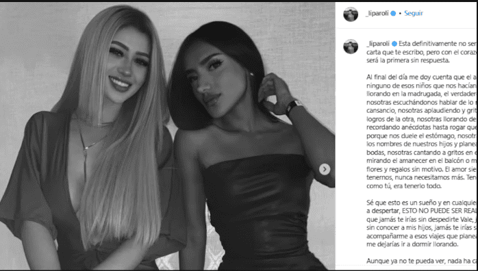 El pasado martes 13 de mayo, durante una transmisión en vivo en TikTok una joven de 23 años, identificada como Valeria Márquez fue asesinada al interior de un salón de belleza ubicado en una plaza comercial de Zapopan, en la colonia Residencial del Valle.La Fiscalía de Jalisco anunció que el caso será investigado por las autoridades como un feminicidio y tras este lamentable hecho, uno de los mensajes que más impacto ha tenido en redes sociales es el de la también creadora de contenido y amiga de Valeria, Sofía Liparoli quien publicó una carta abierta en Instagram para decirle adiós, en ella expresó el vínculo cercano que compartieron durante años, lleno de sueños, complicidad y una conexión fraternal que ahora queda atravesada por el dolor de la pérdida.En su perfil de Instagram, donde reúne a más de 95 mil seguidores, Sofía publicó una colección de imágenes y memorias junto a Valeria Márquez, cabe destacar que la publicación fue borrada horas después, por lo que actualmente no puede encontrarse en su perfil.Las imágenes fueron acompañadas con el texto: “Está definitivamente no será la última carta que te escribo, pero con el corazón roto sé que será la primera sin respuesta”.En su mensaje, Sofía expresó que la relación que compartían trascendía la amistad, convirtiéndose en su auténtico refugio emocional.“Al final del día me doy cuenta que el amor no era ninguno de esos niños que nos hacían llamarnos llorando en la madrugada, el verdadero amor éramos nosotras (…) El amor siempre fue tenernos, nunca necesitamos más. Tener una amistad como tú, era tenerlo todo.Sé que esto es un sueño y en cualquier momento voy a despertar, ESTO NO PUEDE SER REAL, porque sé que jamás te irías sin despedirte Vale…”.Entre las fotografías compartidas, se incluye también una publicación anterior en la que Valeria le dedicó unas palabras a su amiga.“Un día vamos a estar viajando por el mundo juntas, siendo las madrinas de nuestros hijos y estando con los amores de nuestras vidas, riéndonos de todas las veces que nos llamamos a media noche llorando por cosas que no valían la pena, mientras nos tengamos la una a la otra todo va a estar bien. Te adoro muñeca, por favor quédate siempre”, escribió. NA