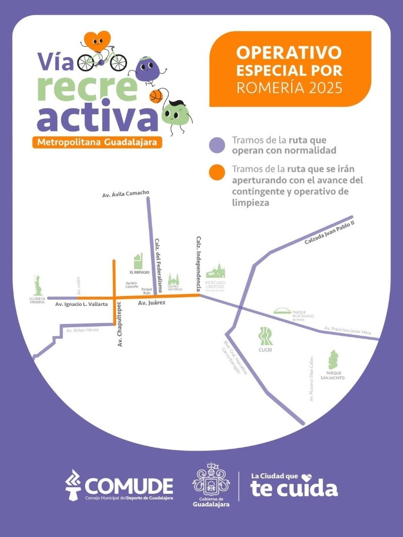 Debido al paso de la Romería de la Virgen de Zapopan, que por primera vez se llevará a cabo en domingo desde el cambio de su ruta en 2015, la Vía RecreActiva de Guadalajara tendrá algunas modificaciones, recordó este viernes el Consejo Municipal del Deporte (Comude) Guadalajara.Informó que el paseo dominical sí operará para el disfrute de las y los usuarios, aunque en su arranque tendrá algunos tramos cerrados. Por ejemplo, el trayecto de la Calzada Independencia hasta la avenida Unión tendrá cierres, así como el ramal de Avenida Chapultepec, entre Justo Sierra y Avenida Niños Héroes."Conforme avance el contingente de peregrinos y el equipo de Aseo Público y Limpia Guadalajara pasen con el operativo de limpieza, se irán reabriendo esos tramos. Se prevé que a partir de las 09:00 horas se abra la Vía en el tramo de la Calzada a Federalismo; a las 10:00 horas, de Federalismo a Chapultepec, y una hora después, el tramo restante", dijo la dependencia municipal.El Comude Guadalajara tiene previsto que a las 11:00 horas el paseo dominical esté restablecido en su totalidad. Respecto a las actividades que se realizan en los espacios públicos que están sobre el trayecto de la Vía, no sufrirán cambios, añadió.Incluso, el Consejo publicó las actividades que la Vía RecreActiva tendrá este domingo en parques y plazas aledañas al trayecto, como el Parque San Jacinto, donde habrá quemados, baile retro, ping pong y baile folclórico, así como módulos informativos.En el Parque Clemente Orozco habrá enseñanza de tejido; mientras que en el Jardín del Carmen, un taller de danza y cultura prehispánica."Cada domingo, los 31 kilómetros de Vía RecreActiva que tiene Guadalajara recibe, aproximadamente, a 110 mil usuarios. Para mayor información sobre las actividades y cierres, se pueden consultar las redes sociales del Comude", recordó la dependencia.Los tramos se irán aperturando conforme pase el contingente de peregrinos y el operativo de limpieza. NA